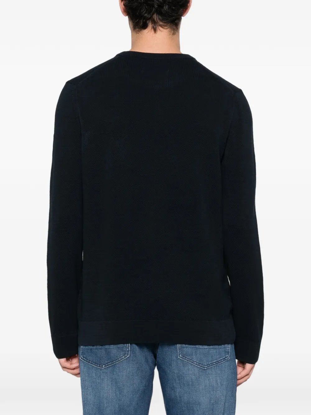 Темно-синий свитер с круглым вырезом, длинными рукавами и ребристым низом