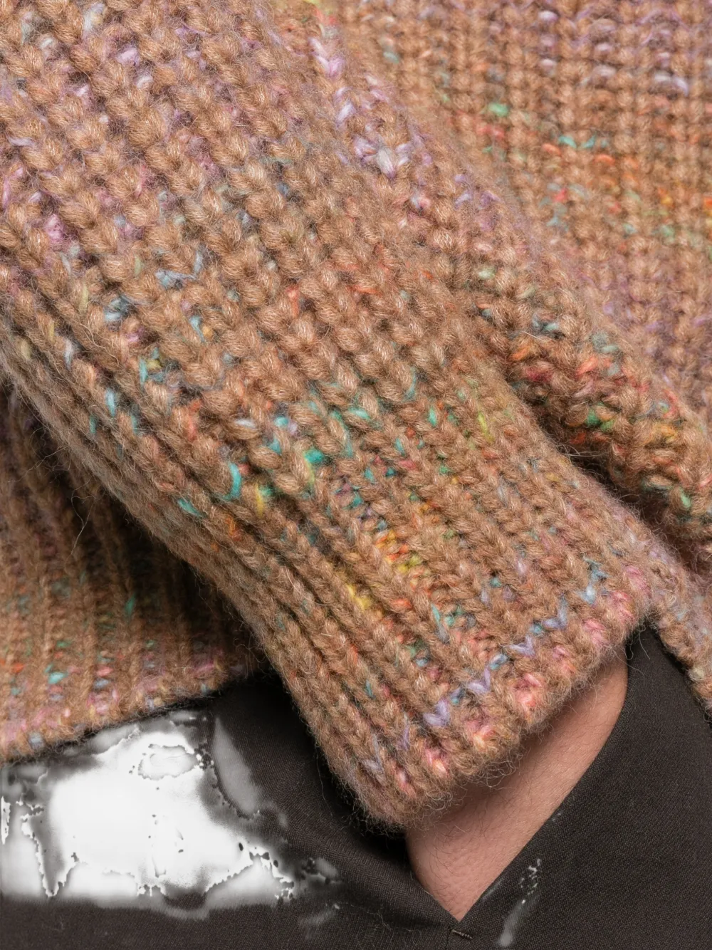 Светло-коричневый свитер с круглым вырезом, длинными рукавами, рубчатым подолом и манжетами.