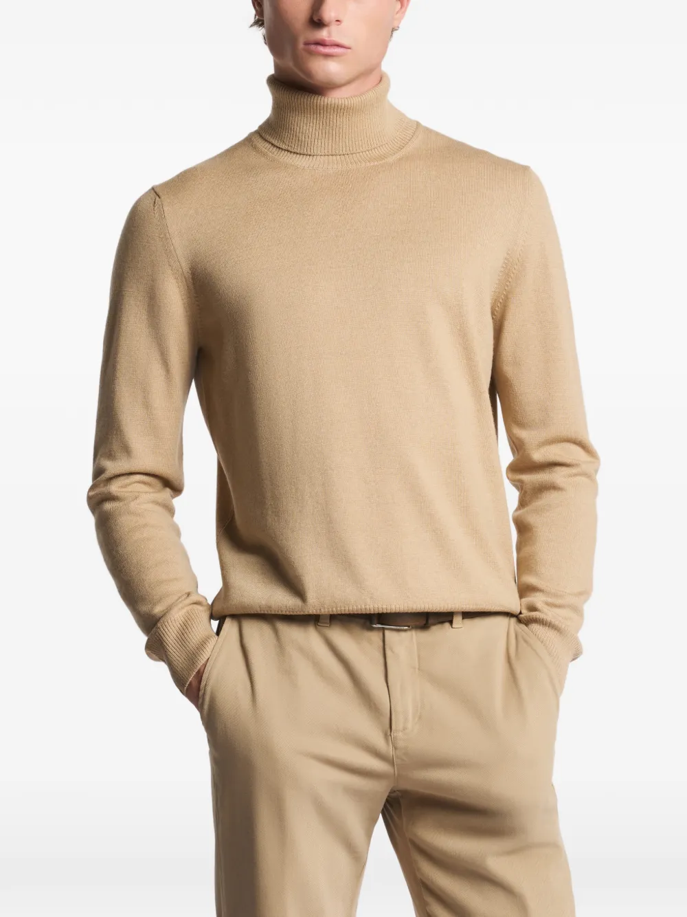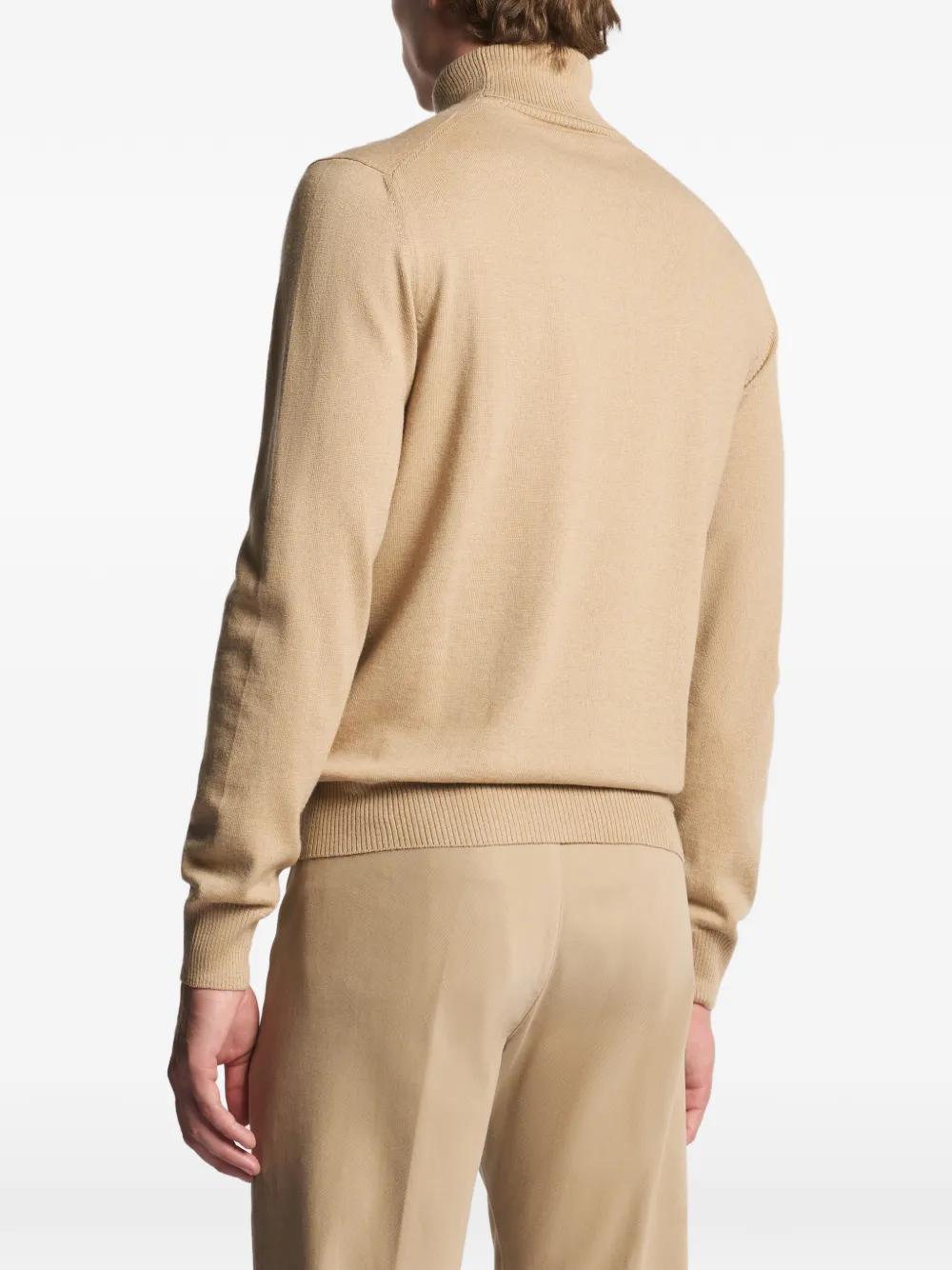 Бежевый свитер с высоким воротником, длинными рукавами и рубчатой отделкой
