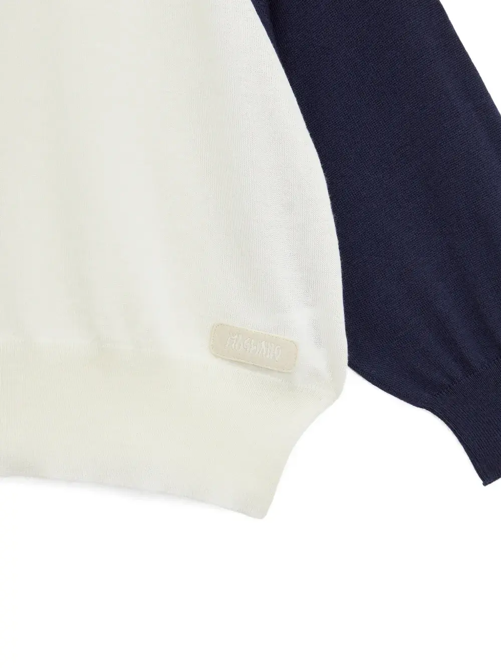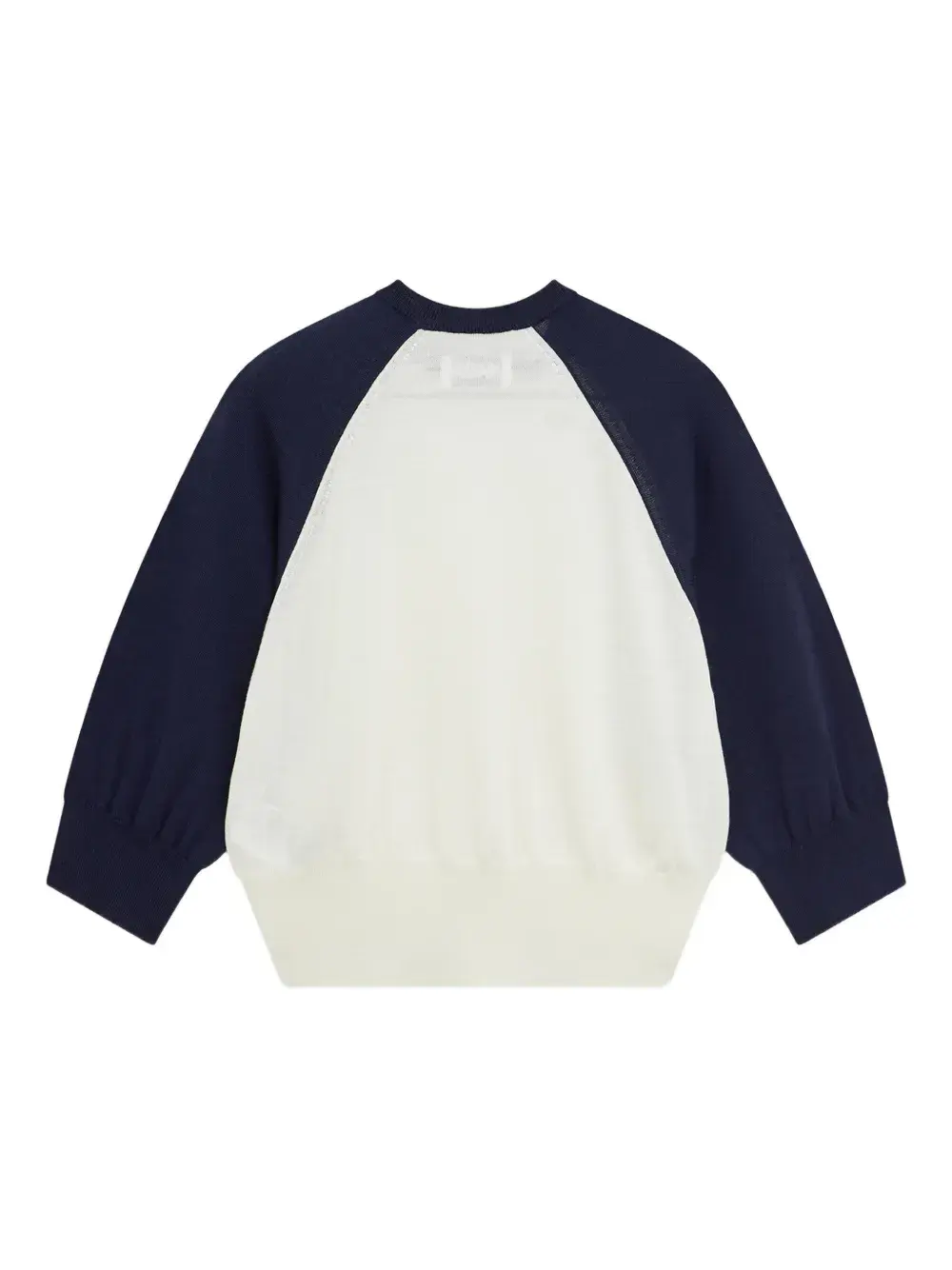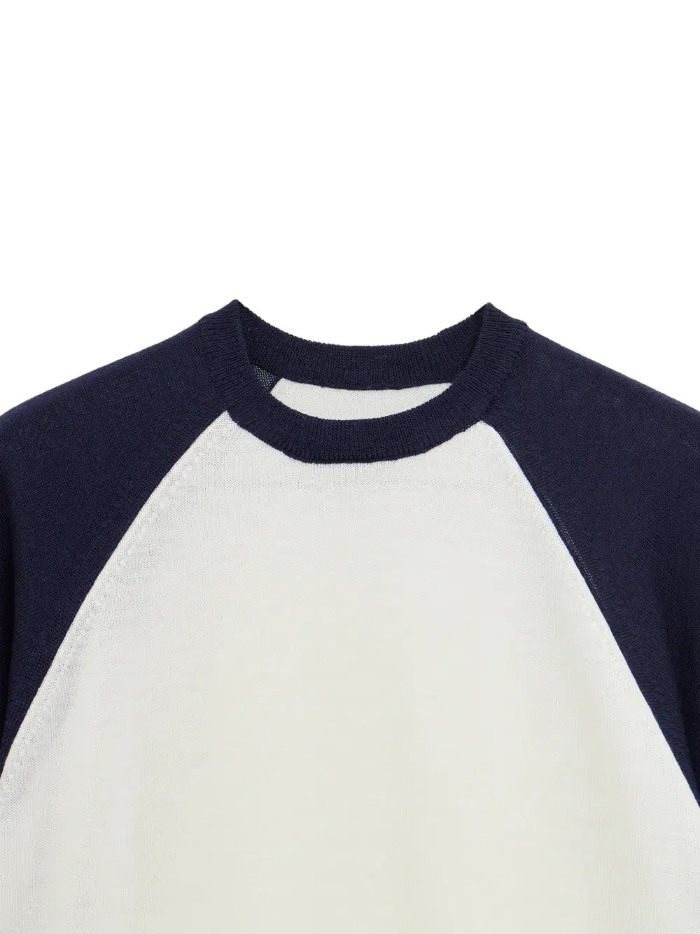 Белые и синие рукава-реглан, круглый вырез, трикотажная конструкция, ребристые манжеты, однотонная нашивка с логотипом