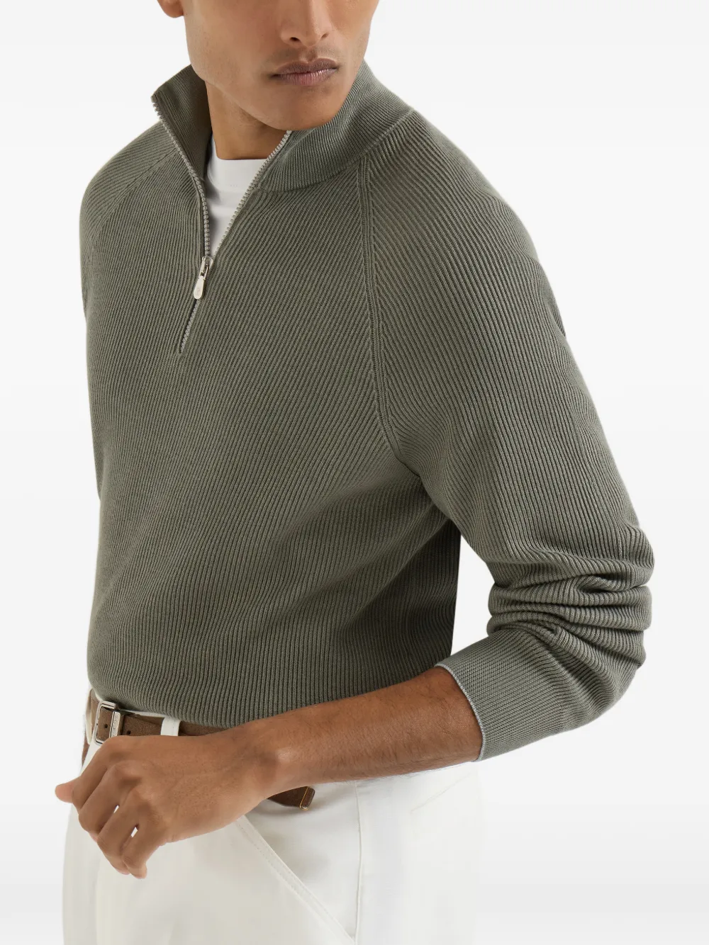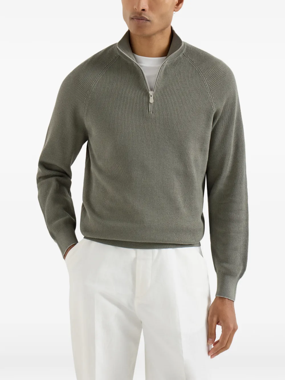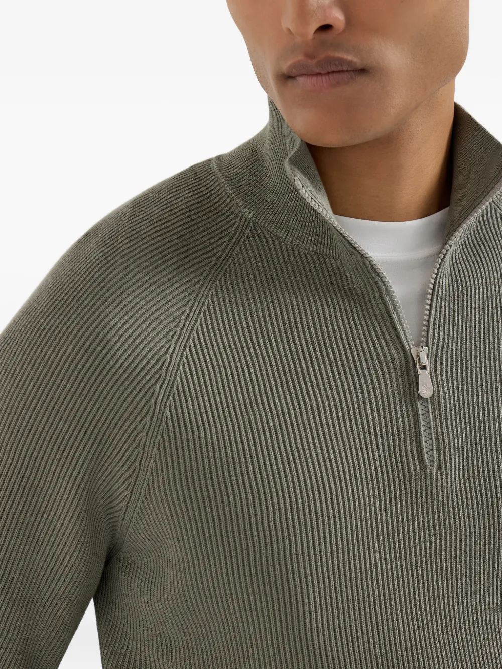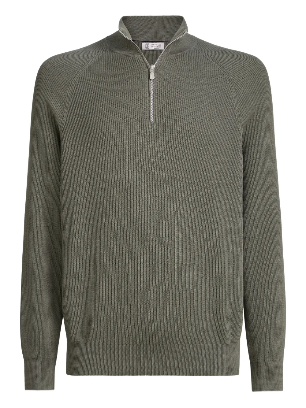 Свитер в рубчик с воротником на молнии Brunello Cucinelli, зеленый