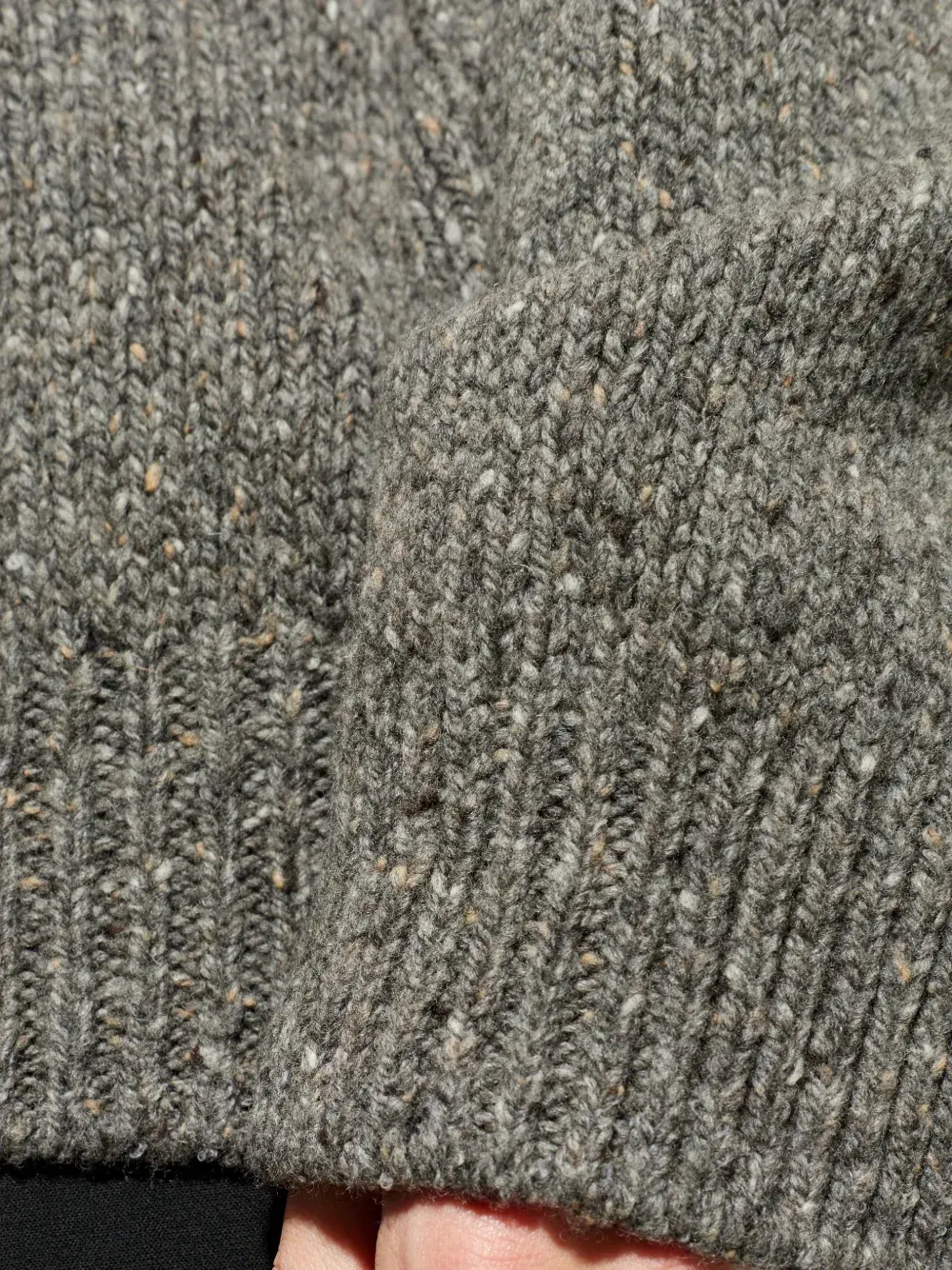 Светло-серый меланж, вязаный трикотаж, круглый вырез, длинные рукава, ребристые манжеты и подол