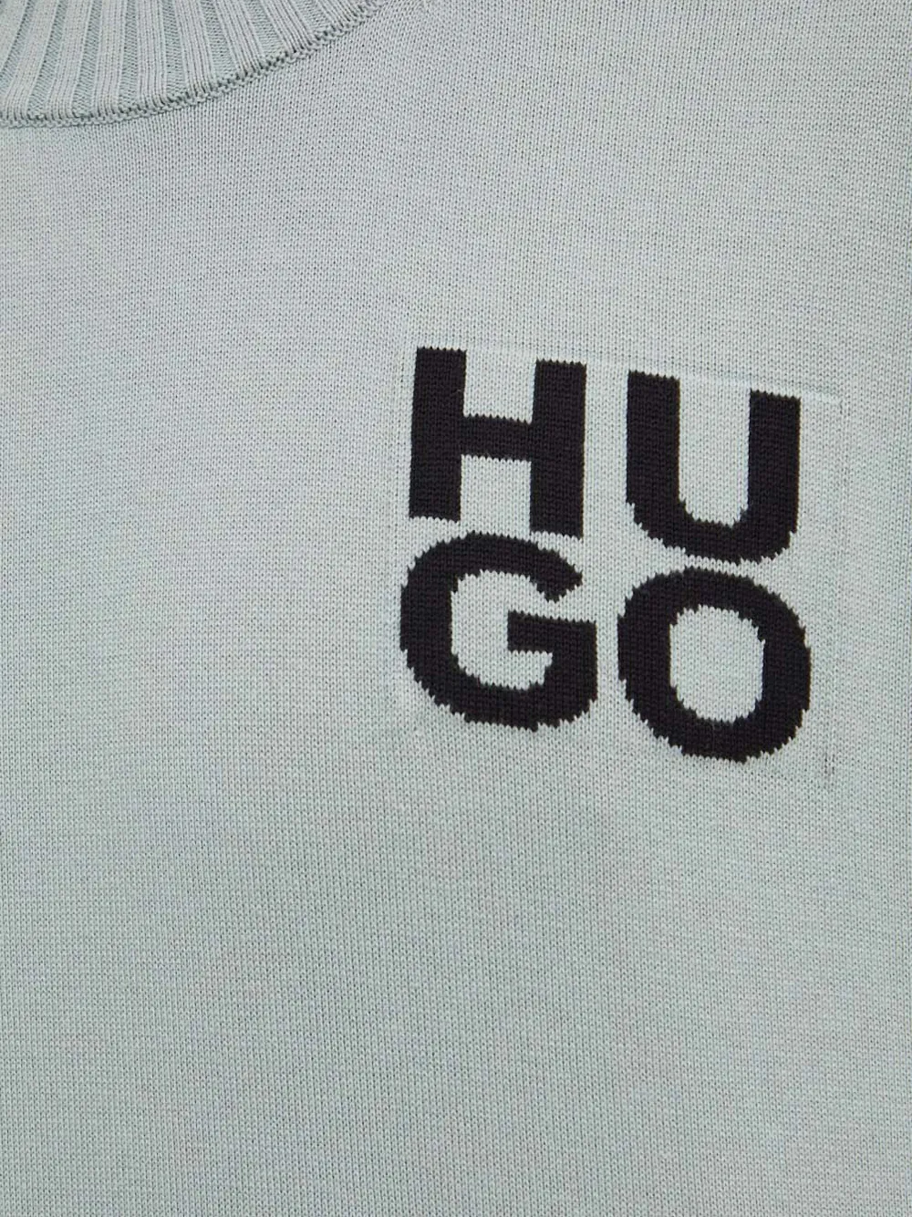 Светло-голубой, вязаная фактура, логотип, отделка в рубчик, круглый вырез, длинные рукава