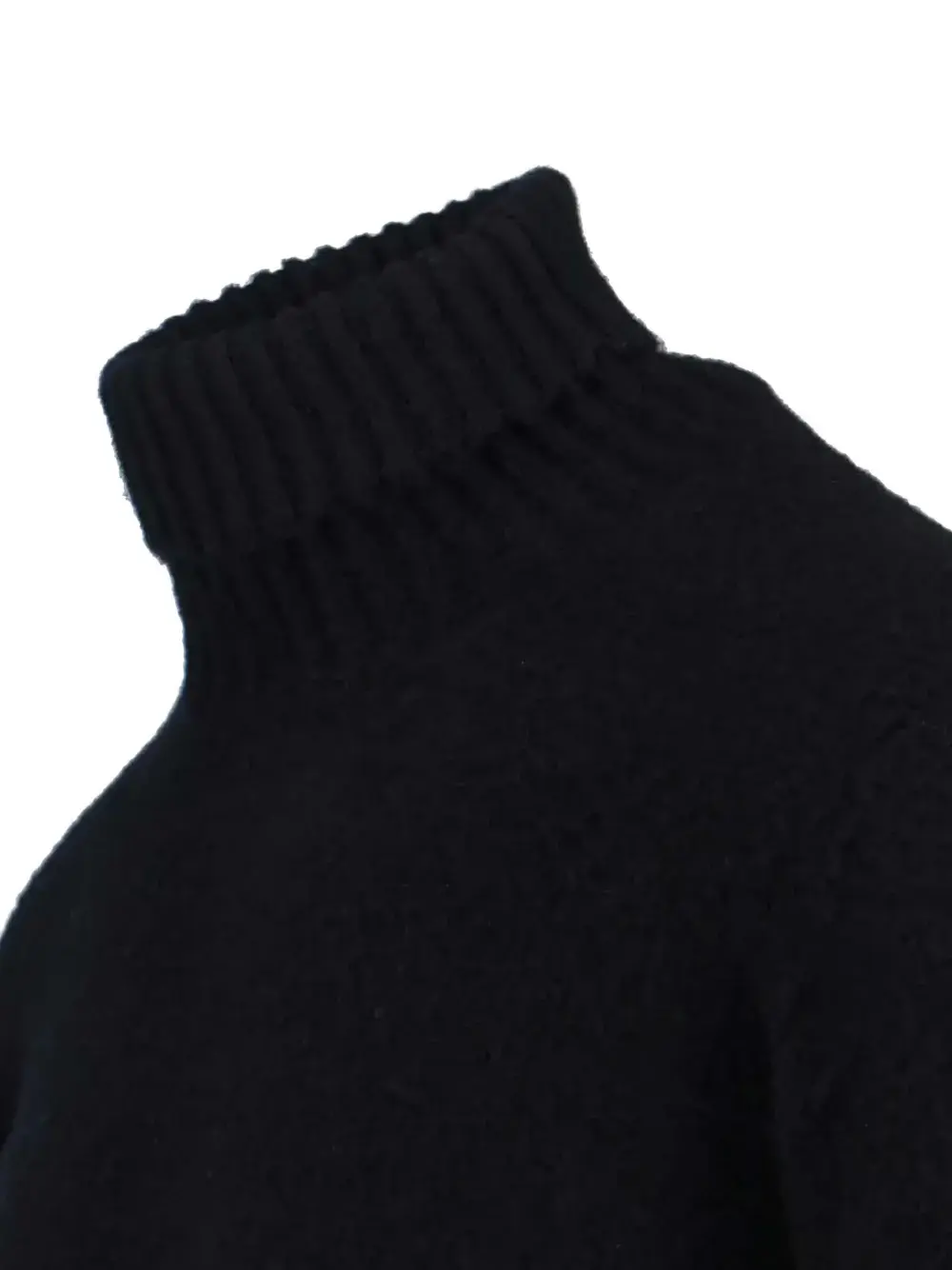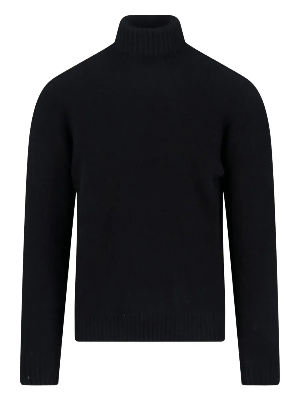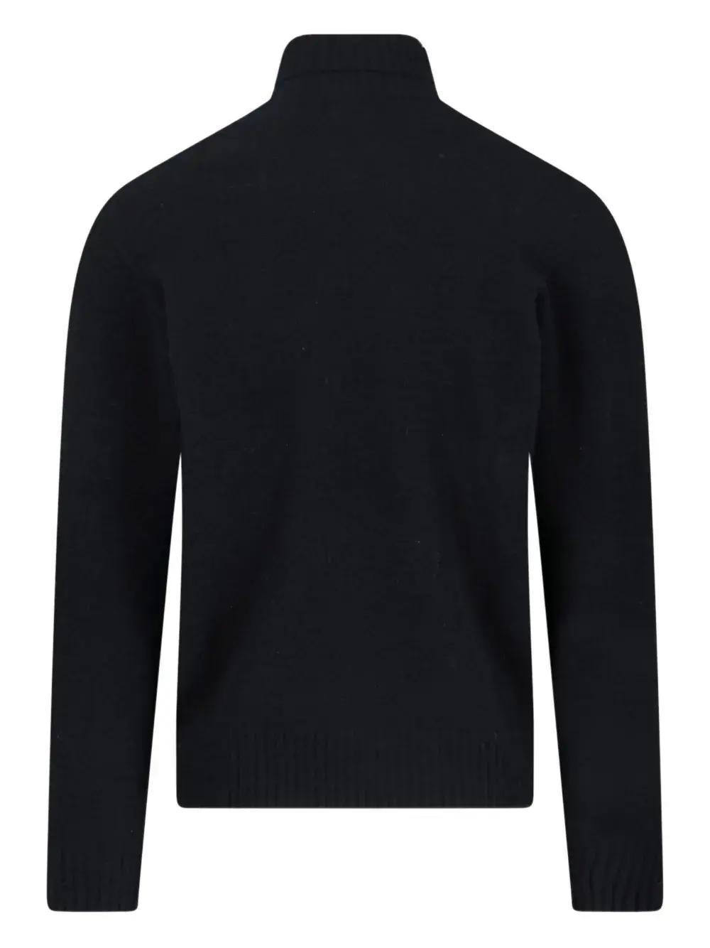 Черный свитер с воротником-стойкой, рубчатой вязкой, длинными рукавами, тонкой вязкой и прямым подолом
