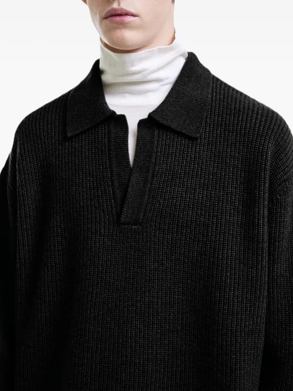 Черный вязаный топ в рубчик с воротником, V-образным вырезом и длинными рукавами