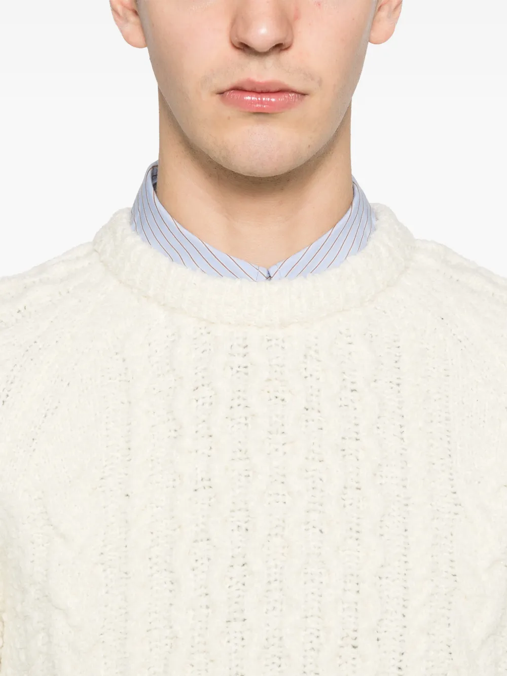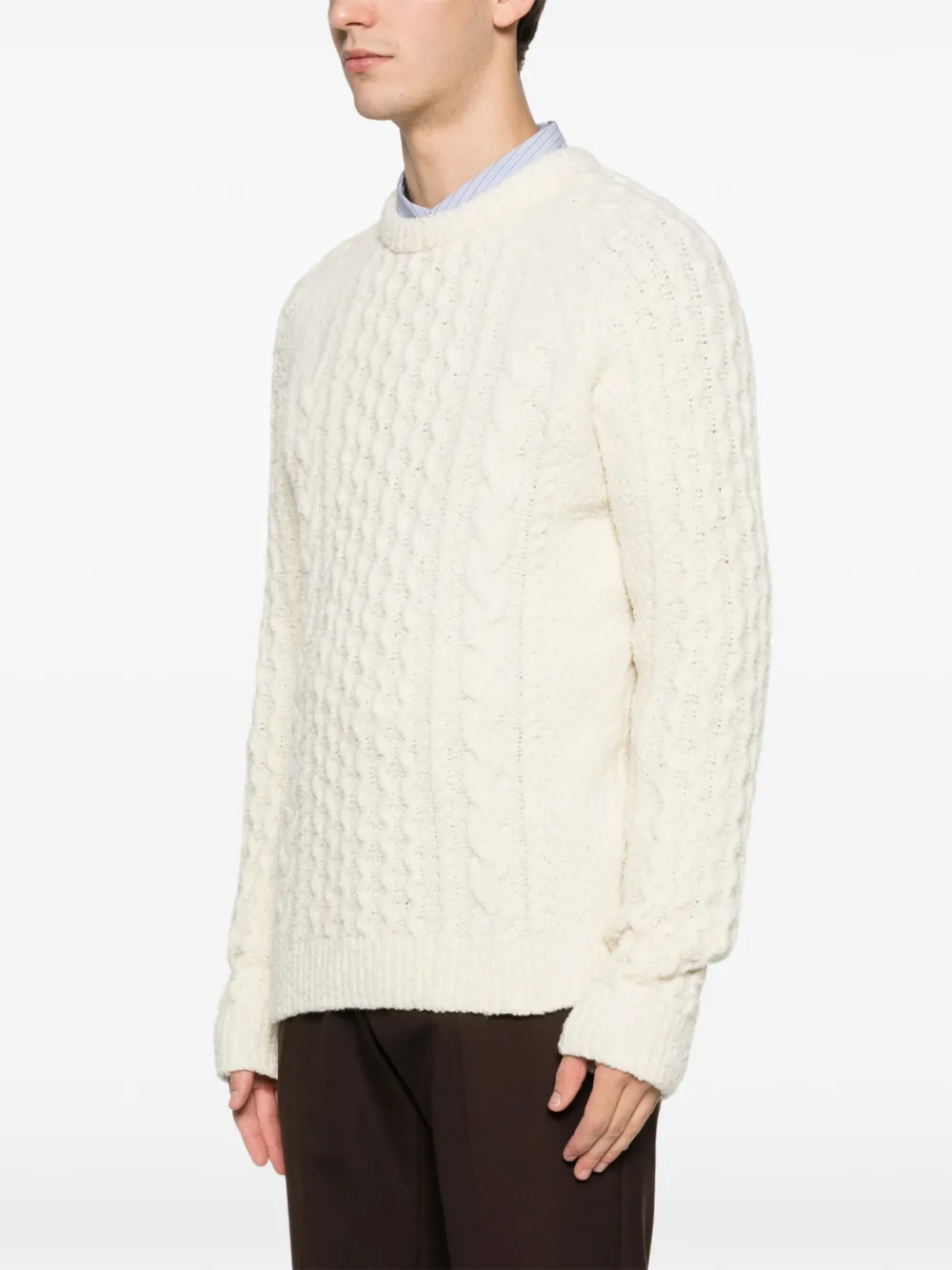 Слоново-костный свитер с круглым вырезом, вязаный косами, ребристый низ, ребристые манжеты, длинные рукава