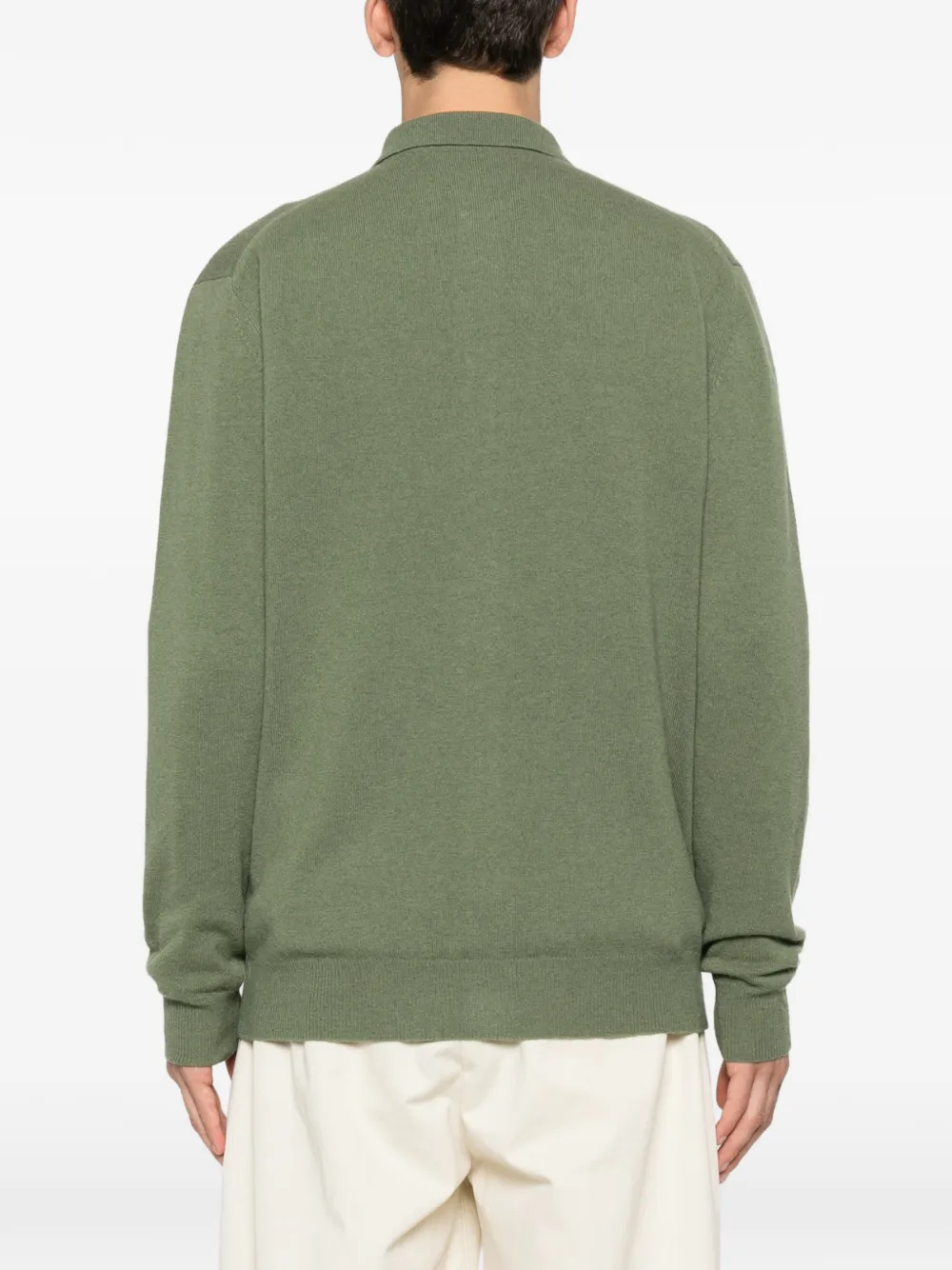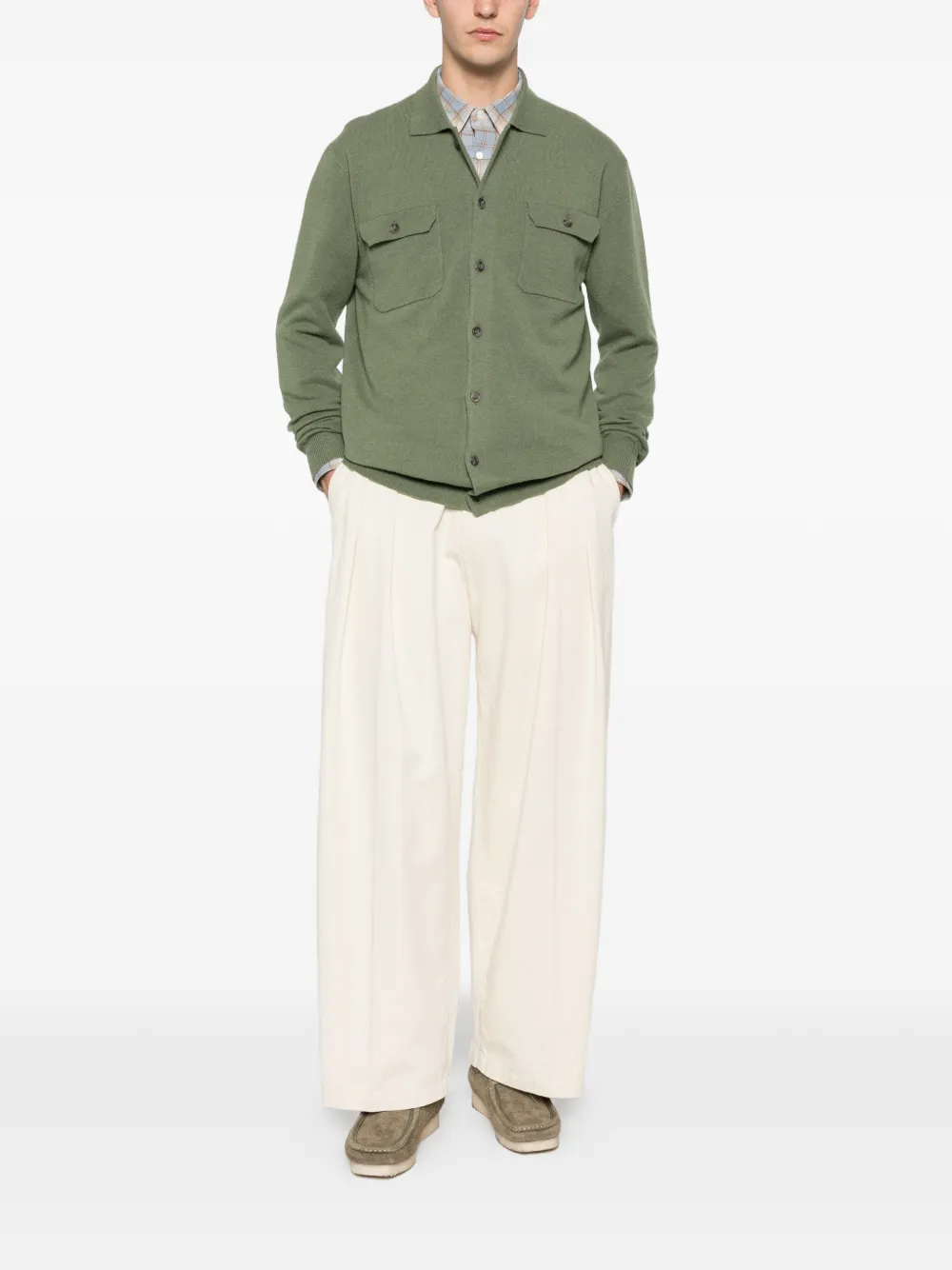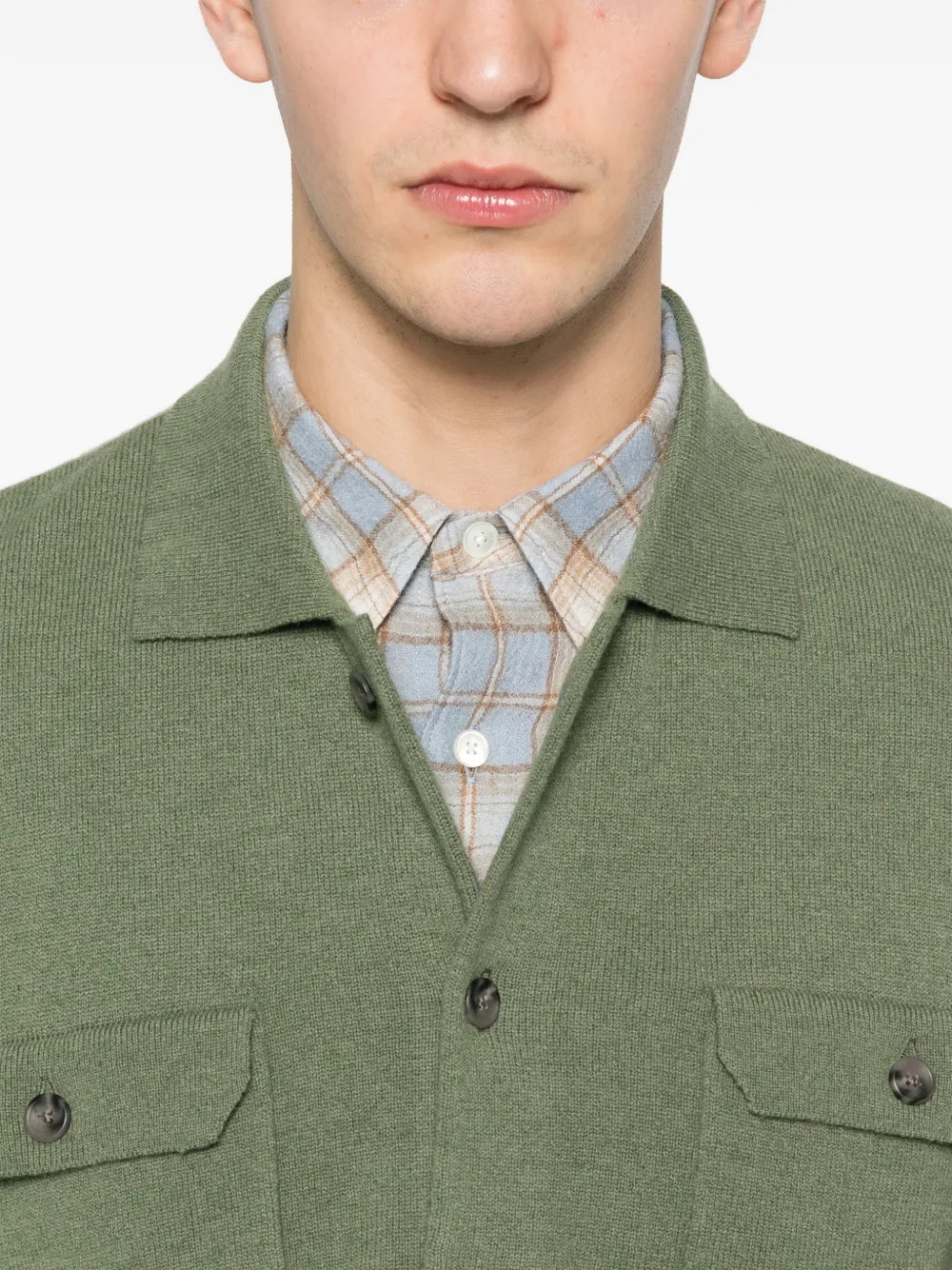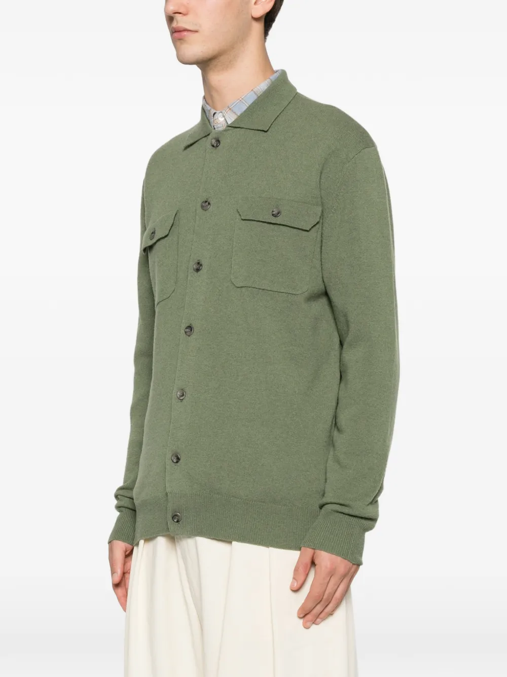 Зелёная рубашка на пуговицах с отложным воротником, нагрудными карманами, длинными рукавами и ребристым подолом