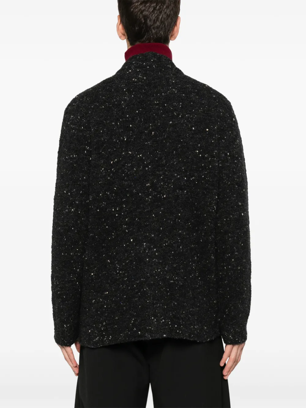 Антрацитовый шерстяной трикотаж, застежка на пуговицы, длинные рукава, фактурная отделка