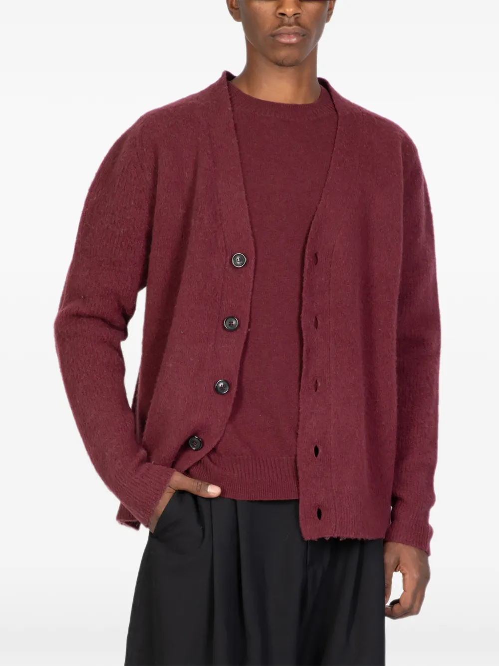 Бордовый кардиган на пуговицах спереди, с круглым вырезом, длинными рукавами и накладным карманом спереди