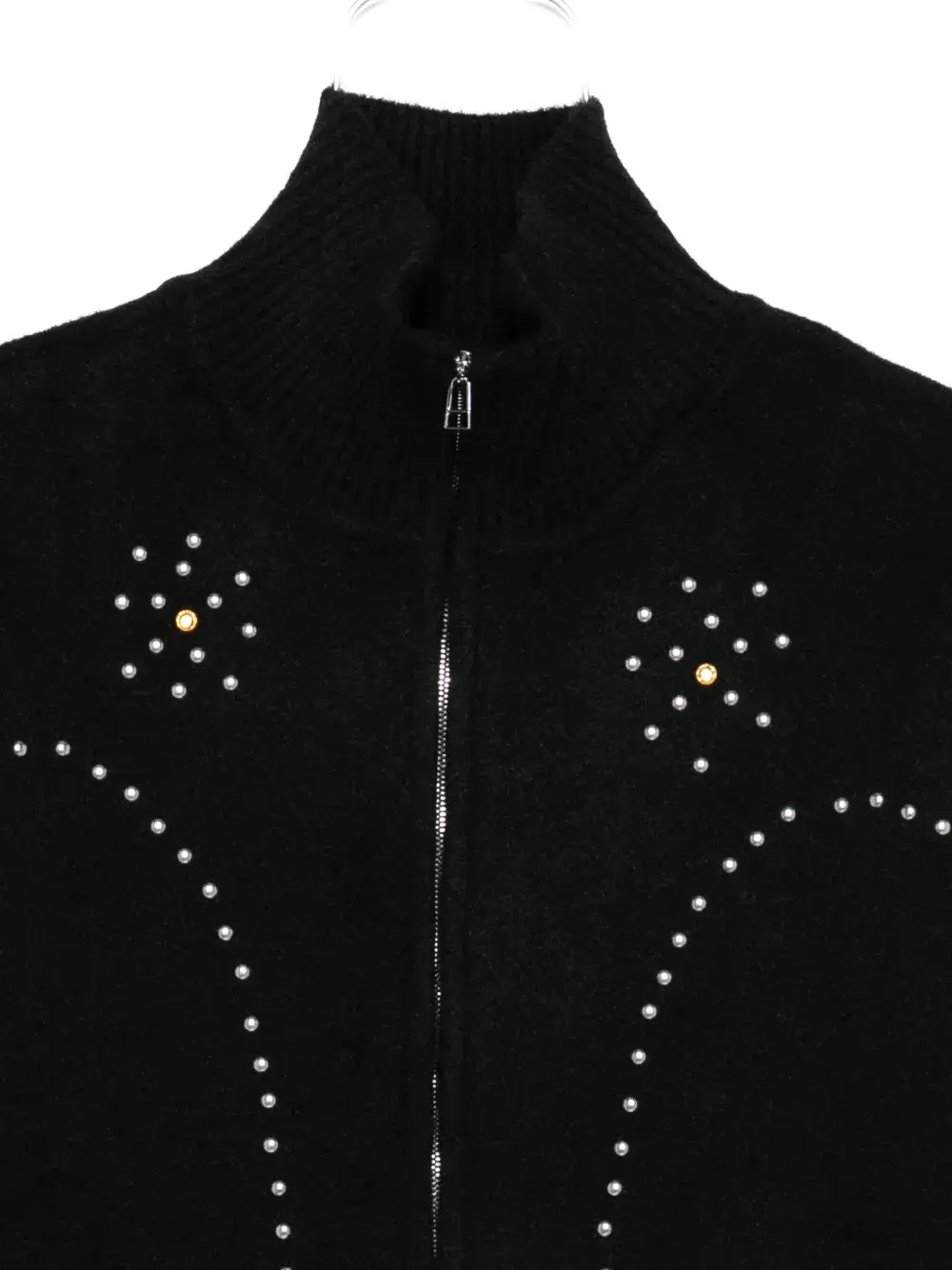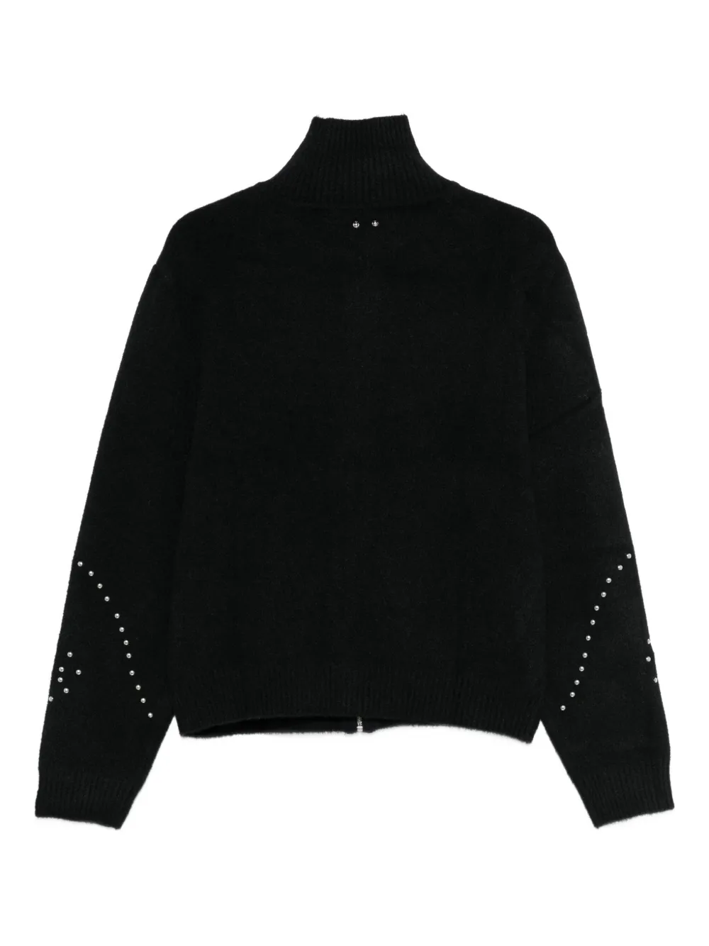 Чёрная застёжка-молния, длинные рукава, трикотажные манжеты, украшение заклёпками