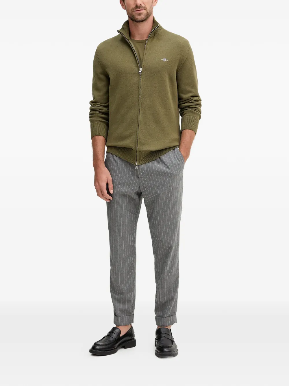 Оливково-зеленый кардиган с вышитым логотипом, застежкой-молнией, длинными рукавами и ребристой вязкой