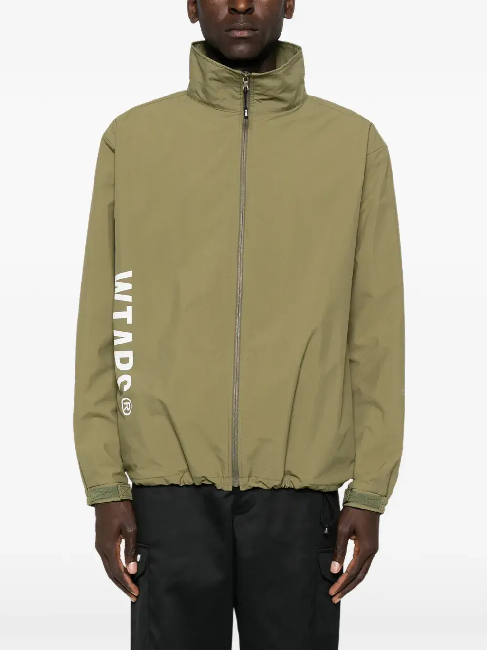 Оливково-зеленый цвет, принт с логотипом, застежка-молния, высокий воротник, длинные рукава, манжеты на липучках