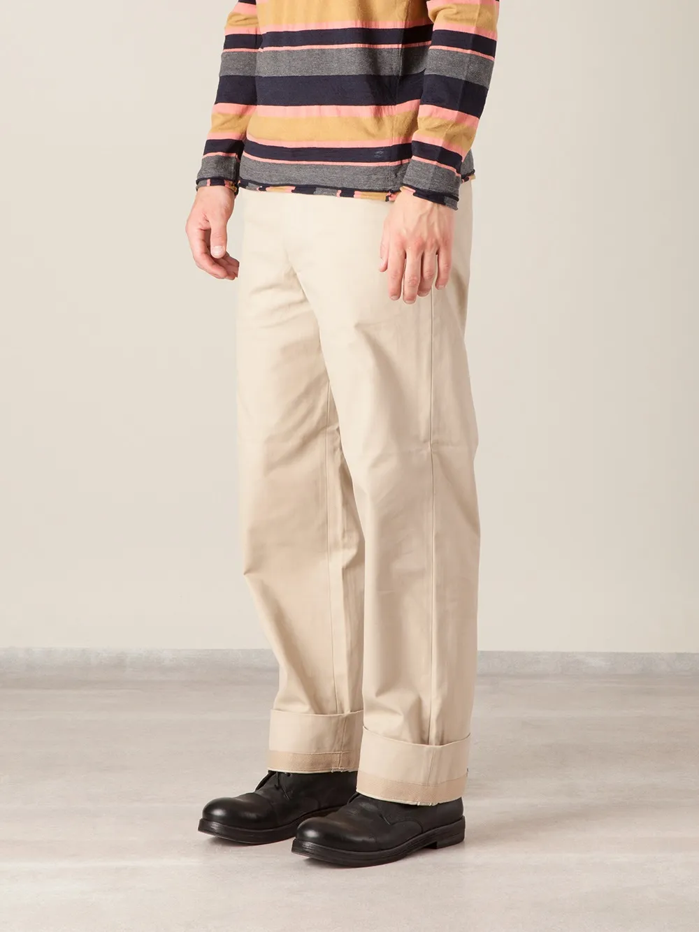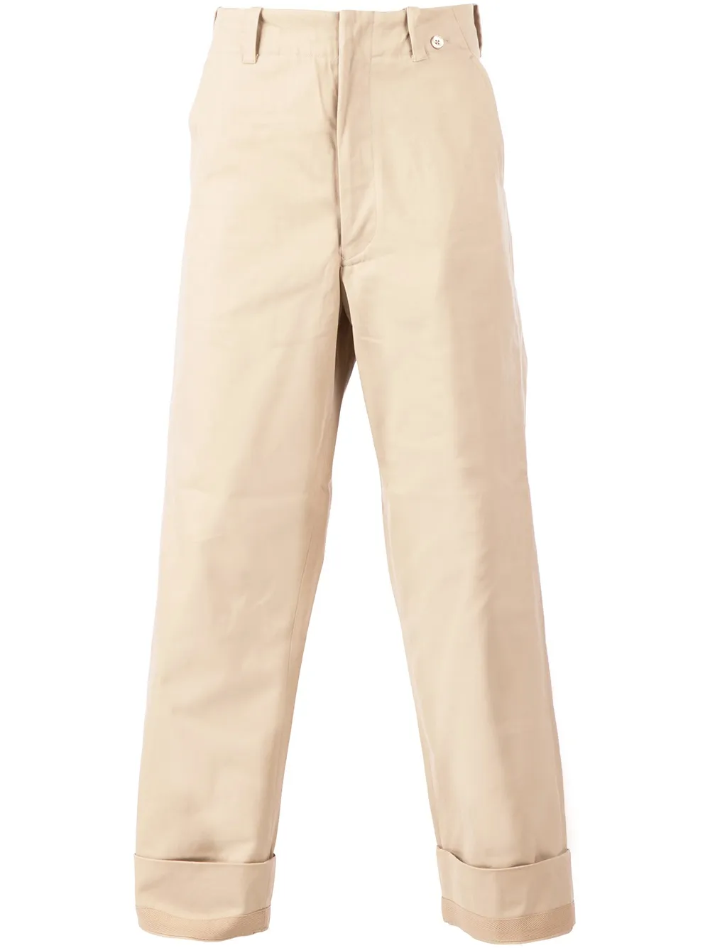 Бежевые хлопковые чиносы широкого кроя от Salvy. Потайная застёжка спереди, петли для ремня, боковые карманы, карман-заплатка.