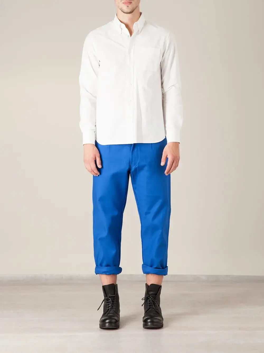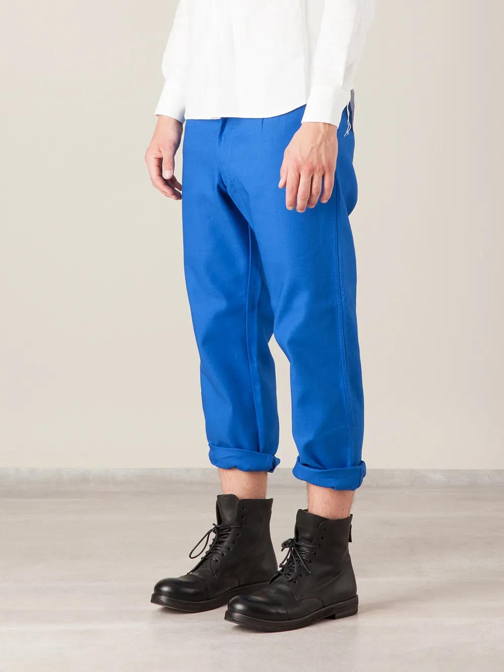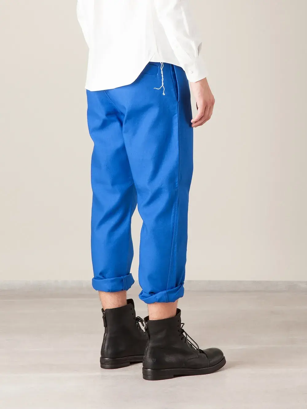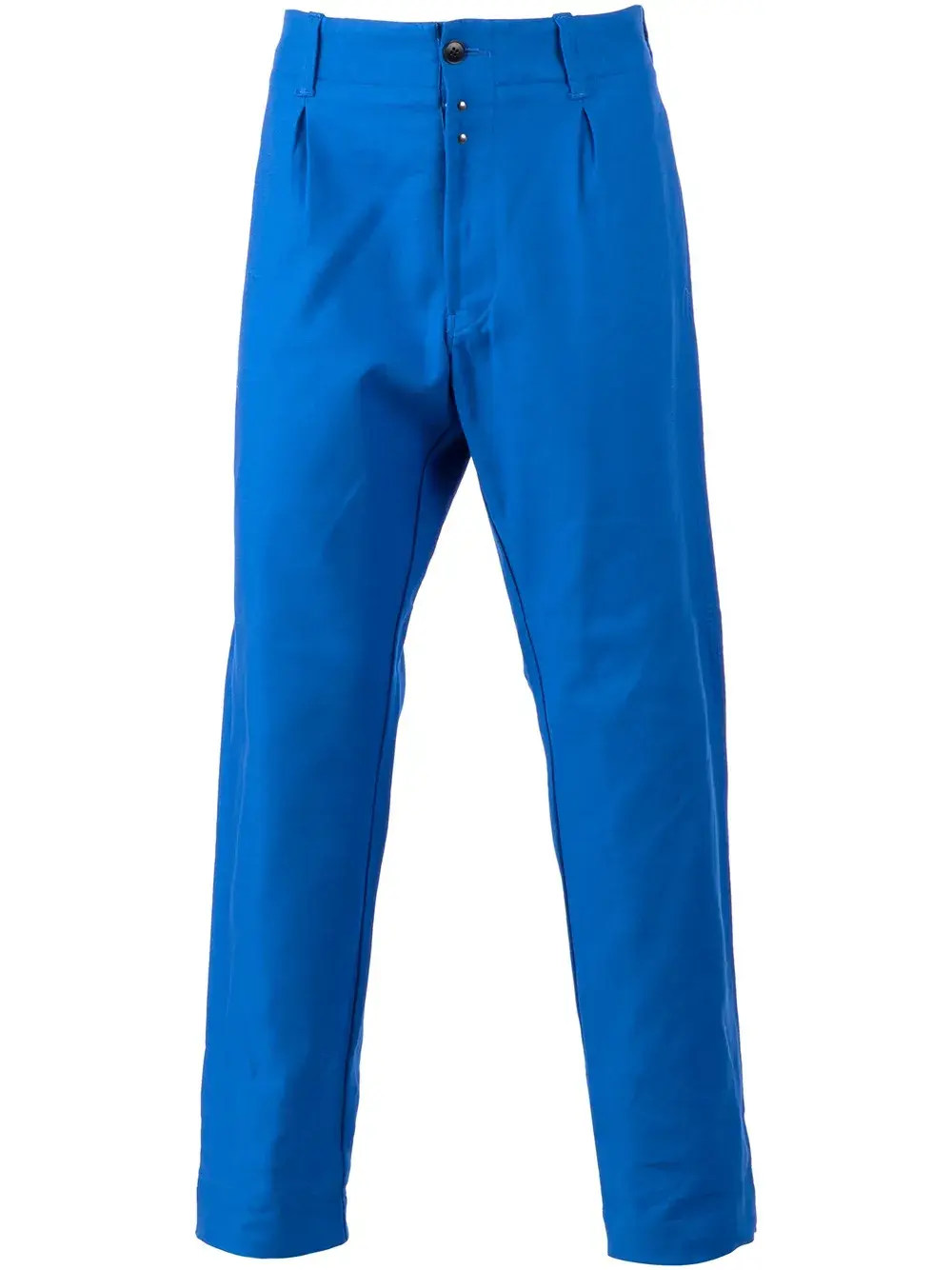 Синие хлопковые повседневные чиносы от Salvy. Прямые брючины, застёжка на пуговице и молнии, петли для ремня, деталь со складками, боковые карманы, задние карманы с листочкой.