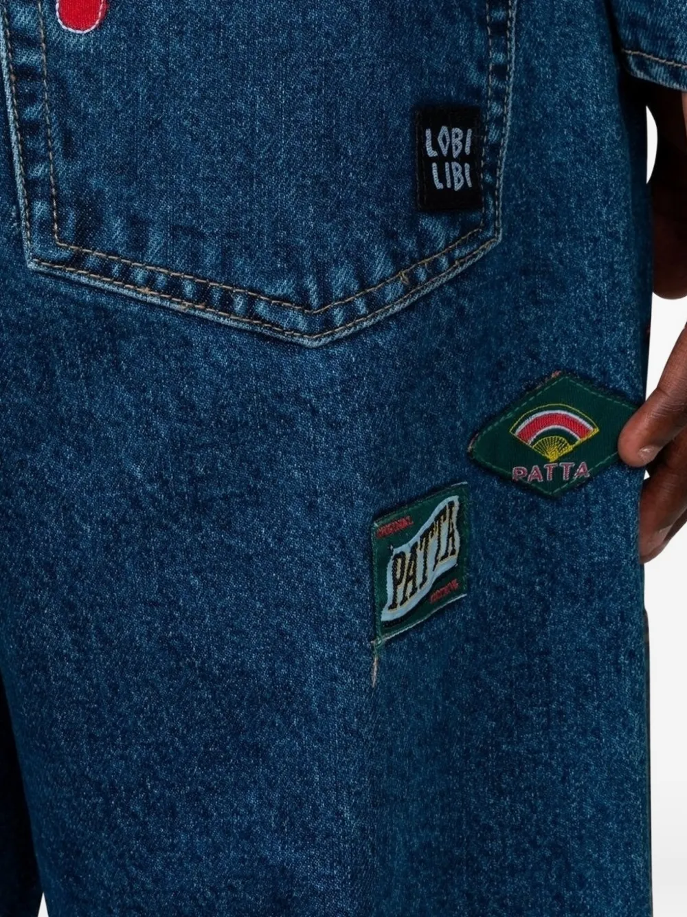Синий лоскутный дизайн, пять карманов, вышивка с логотипом, шлевки для ремня