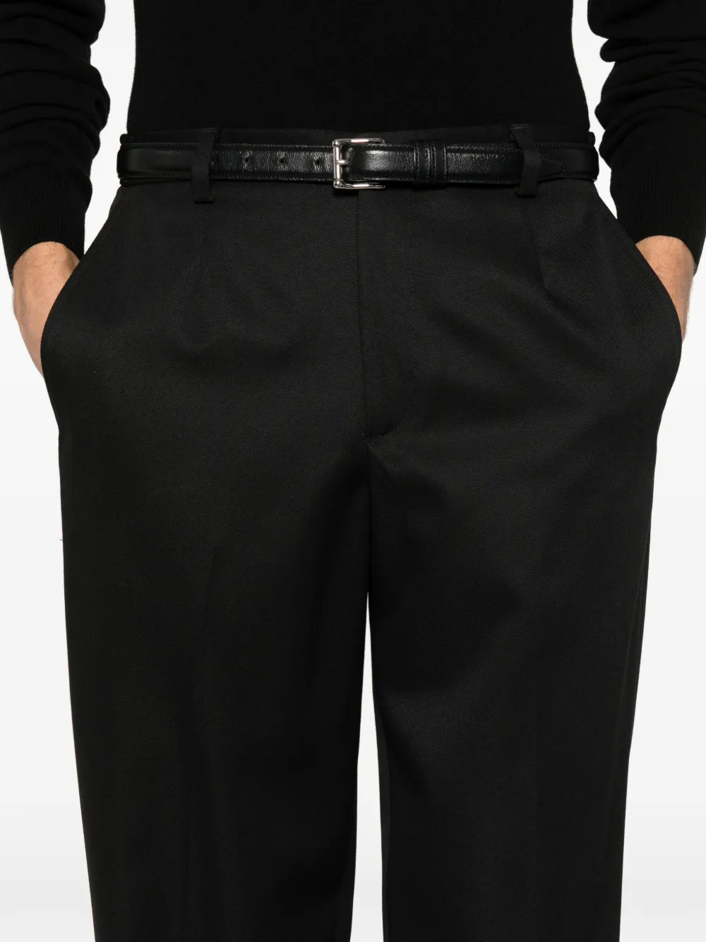 Чёрные, эластичный пояс, застёжка на пуговицу, шлёвки для ремня, боковые карманы, задний прорезной карман