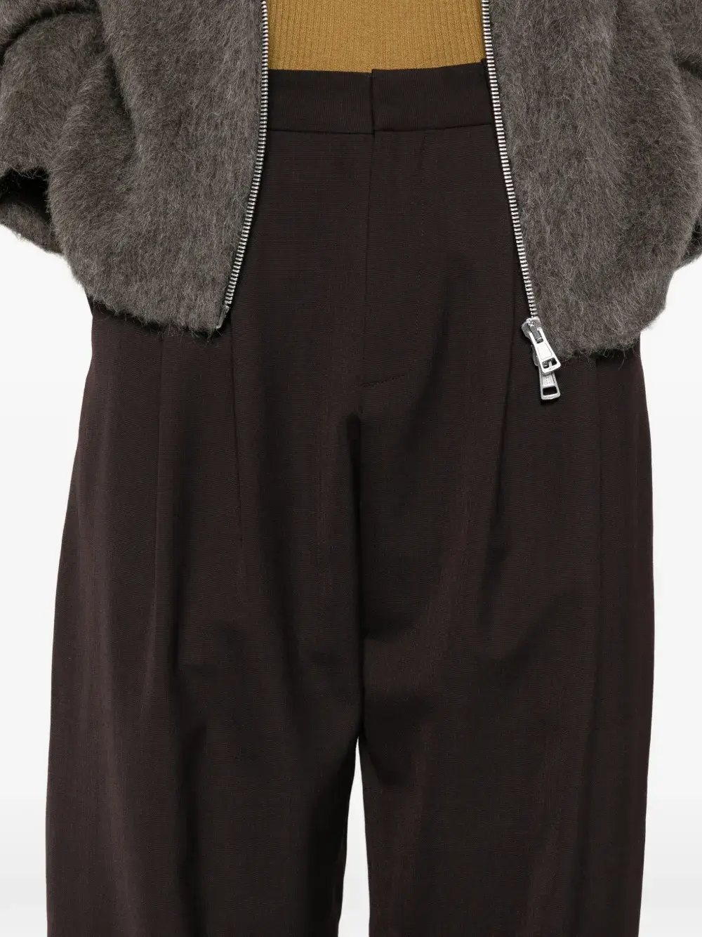 Коричневые плиссированные брюки с боковыми карманами, шлёвками для ремня и заутюженными стрелками