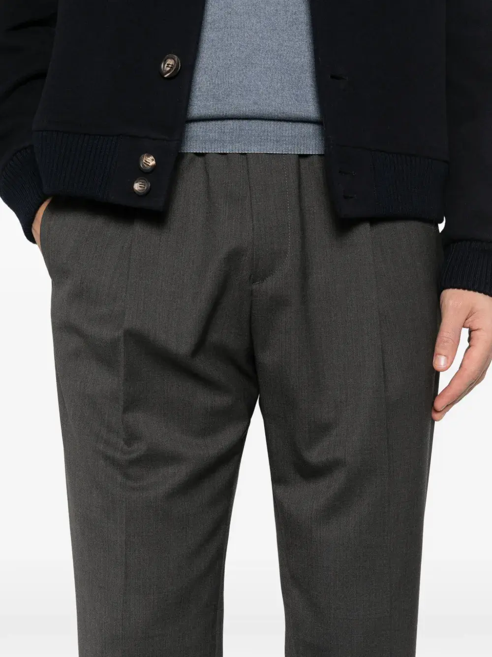 Серая модель с поясом на завязке, боковыми карманами-врезами и задними прорезными карманами