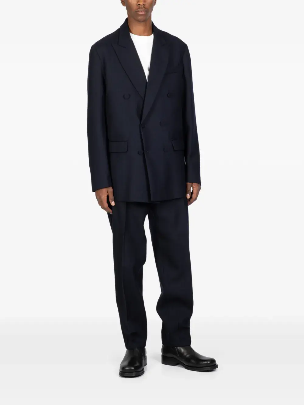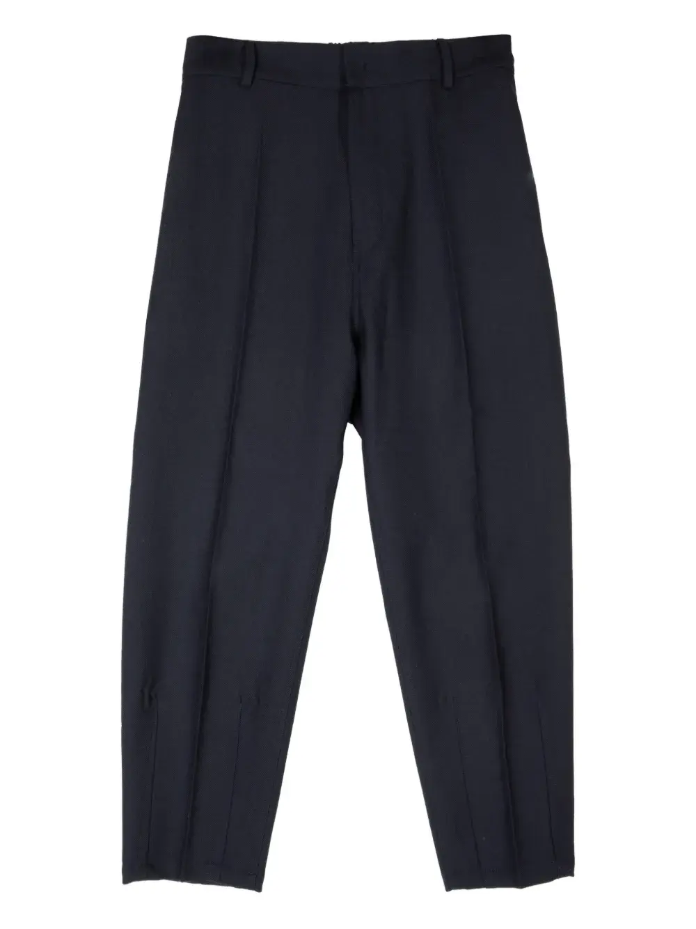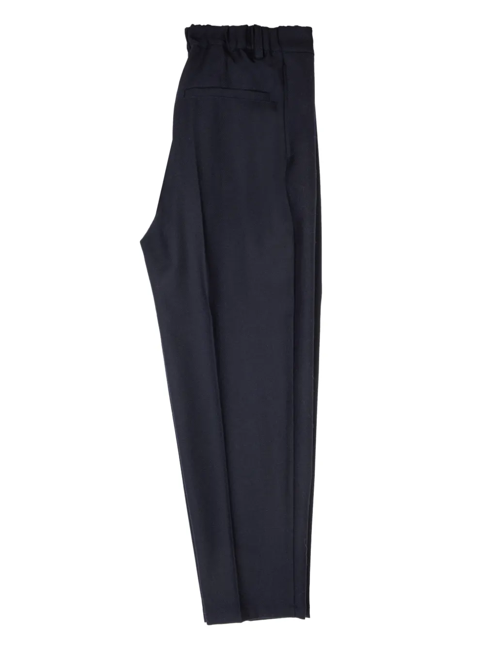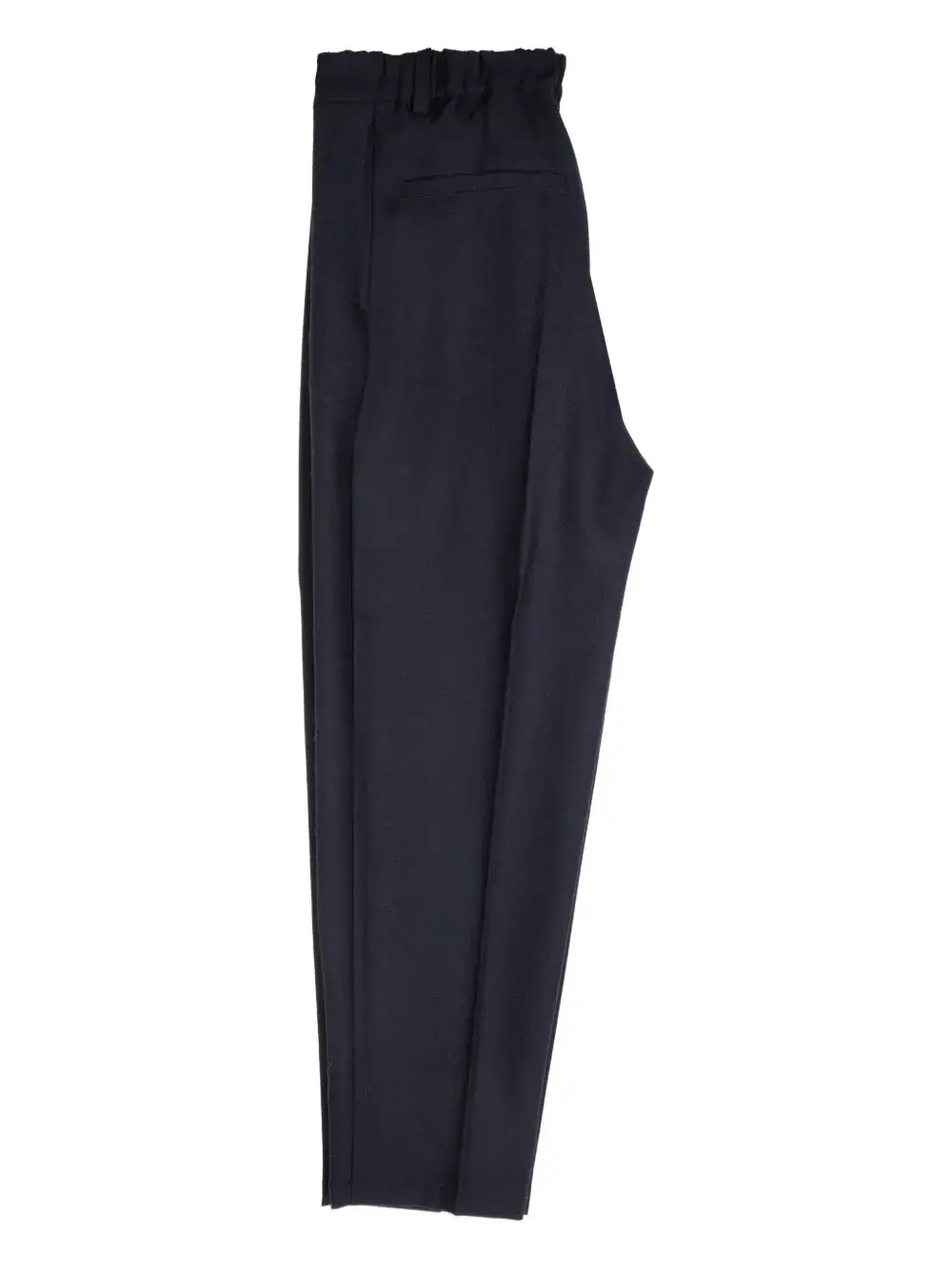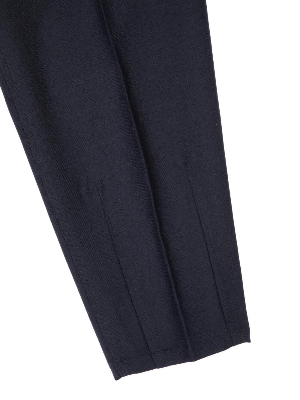 Темно-синий цвет, эластичный пояс, задний прорезной карман, разрезы на щиколотках, декоративные швы