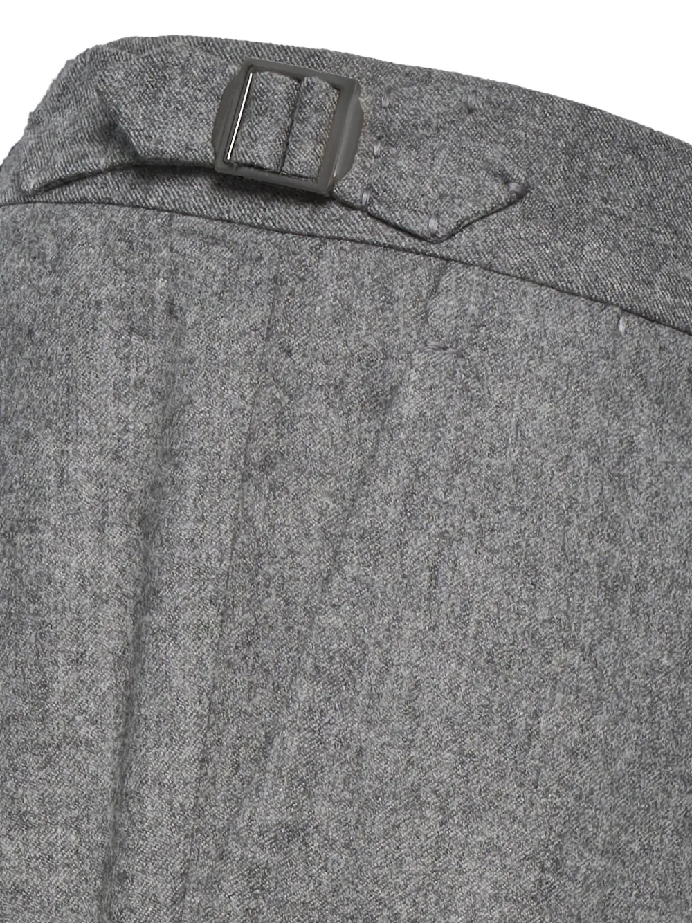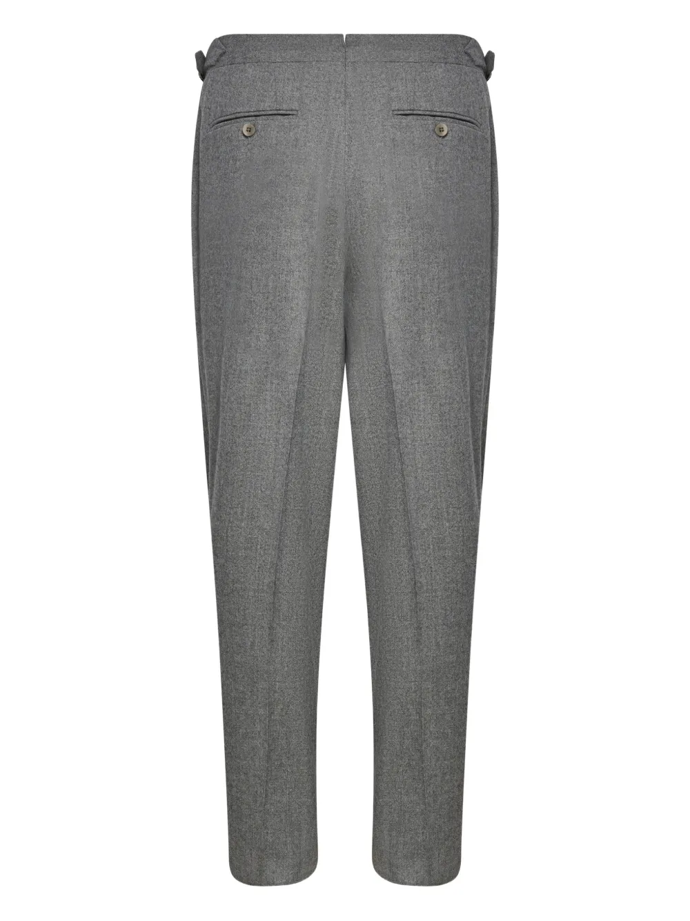 Серые брюки с задними прорезными карманами на пуговицах, застежкой-молнией спереди, регулируемыми боковыми ремешками и стрелками на брючинах