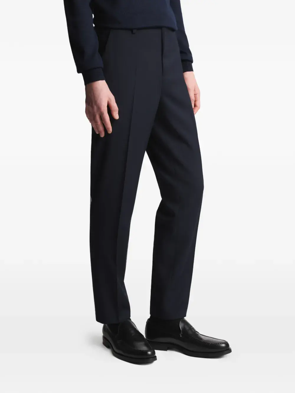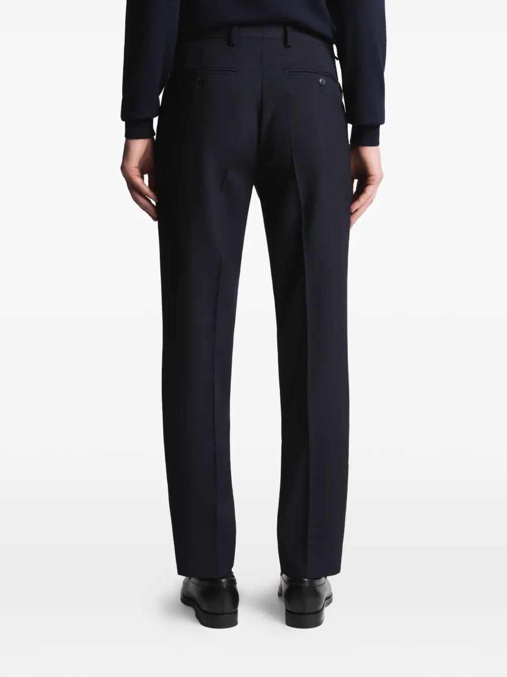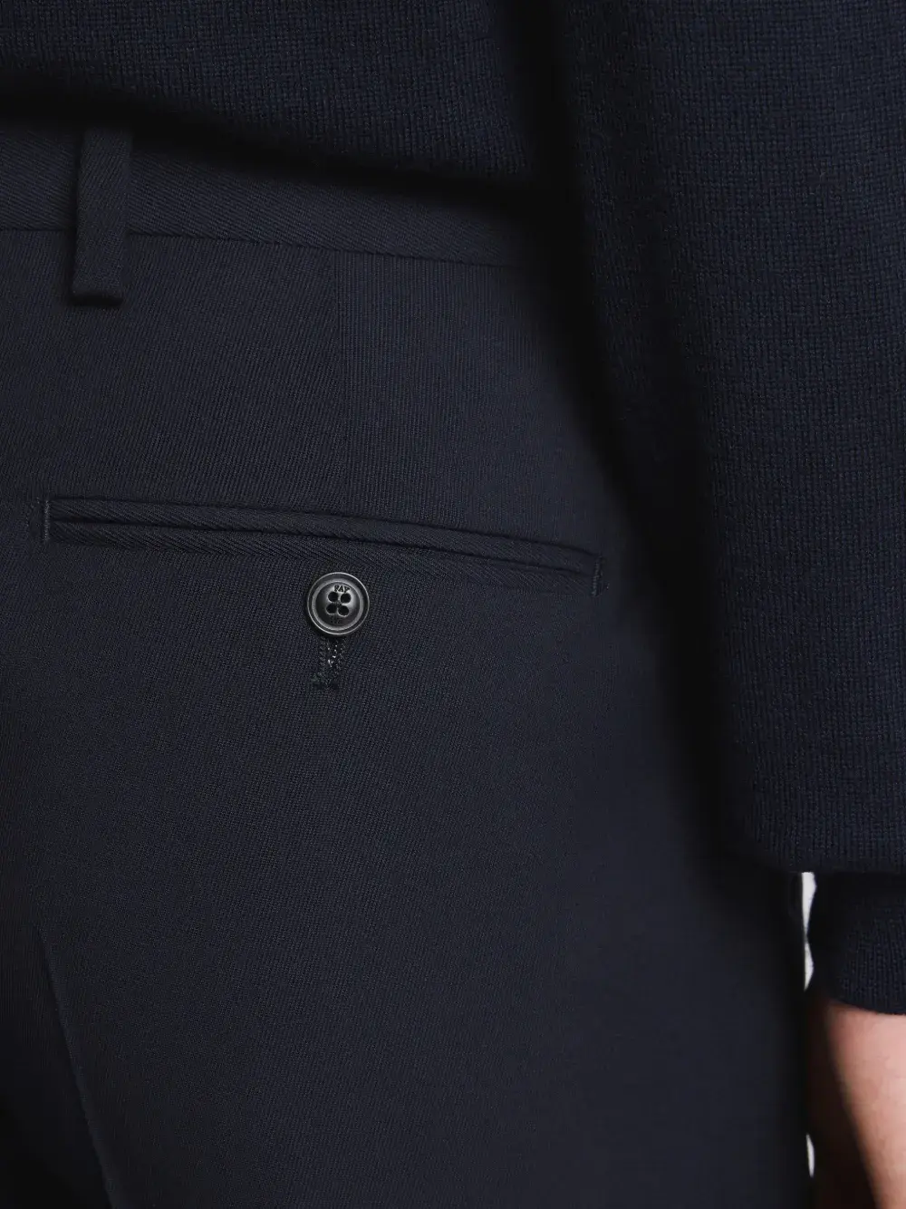 Темно-синий цвет, прорезные карманы сзади на пуговицах, застежка-молния и пуговица, шлевки для ремня