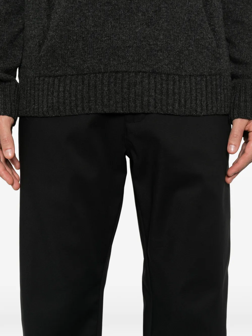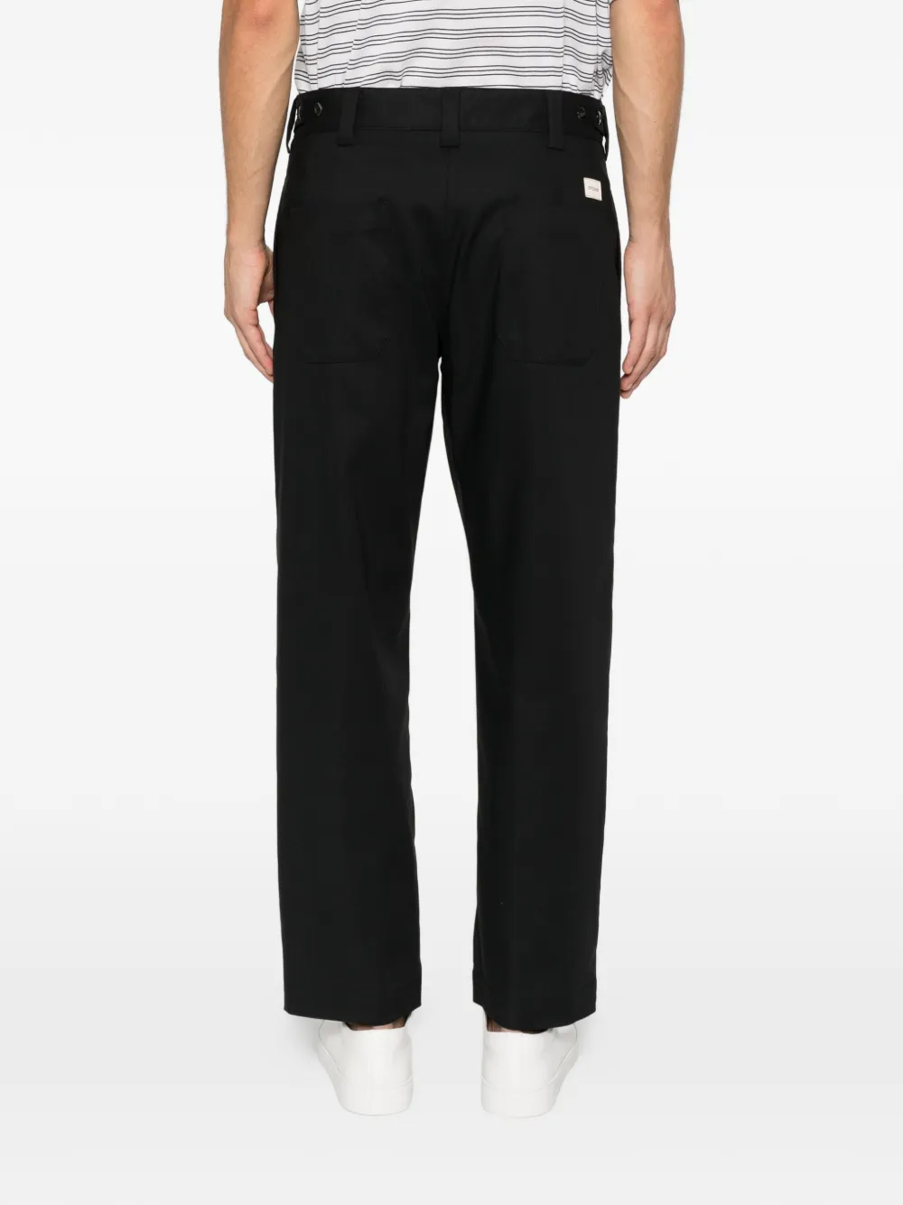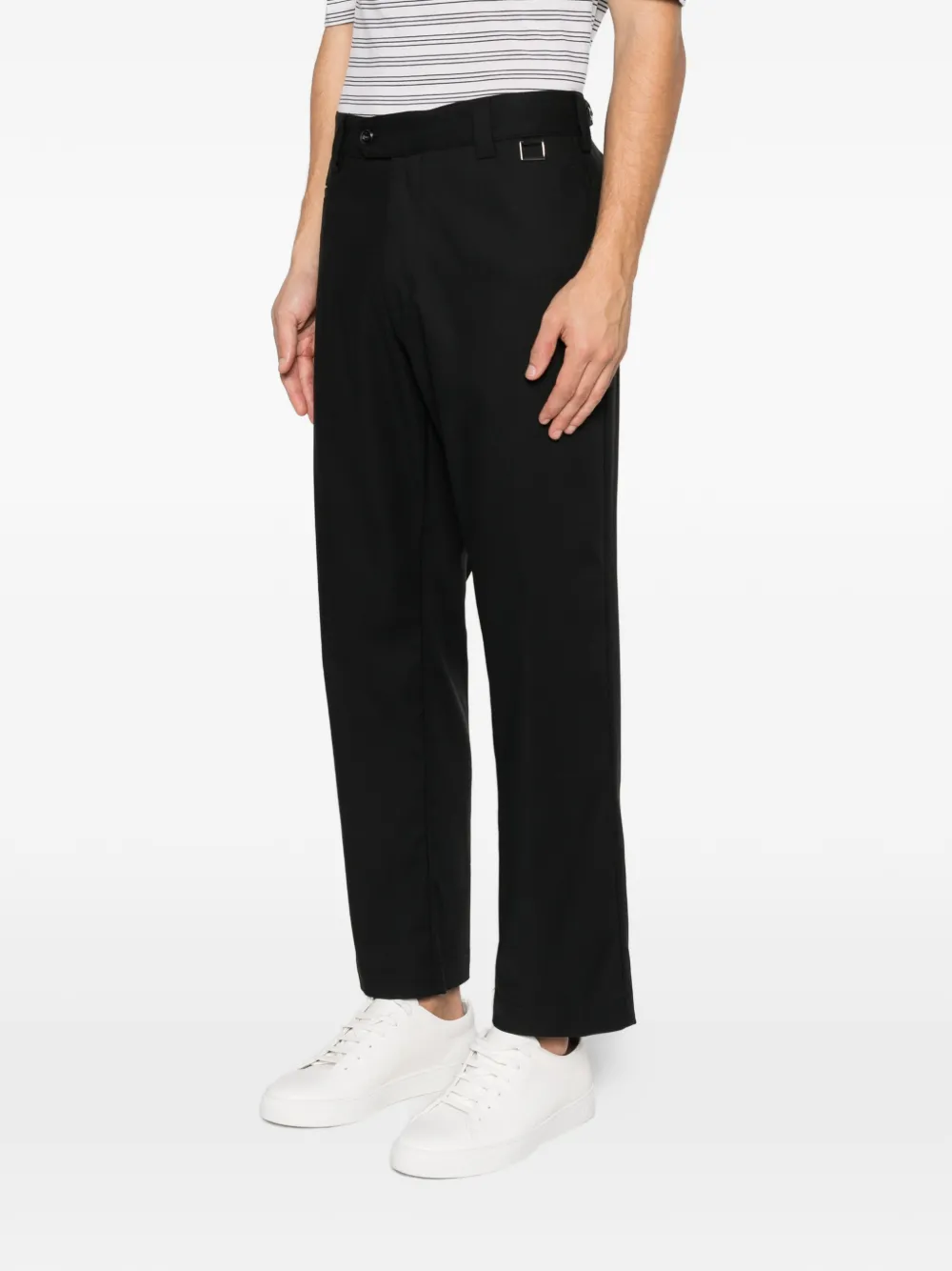 Черные, стандартного кроя, шлевки для ремня, прорезные карманы, застежка на пуговицу, прямые брючины