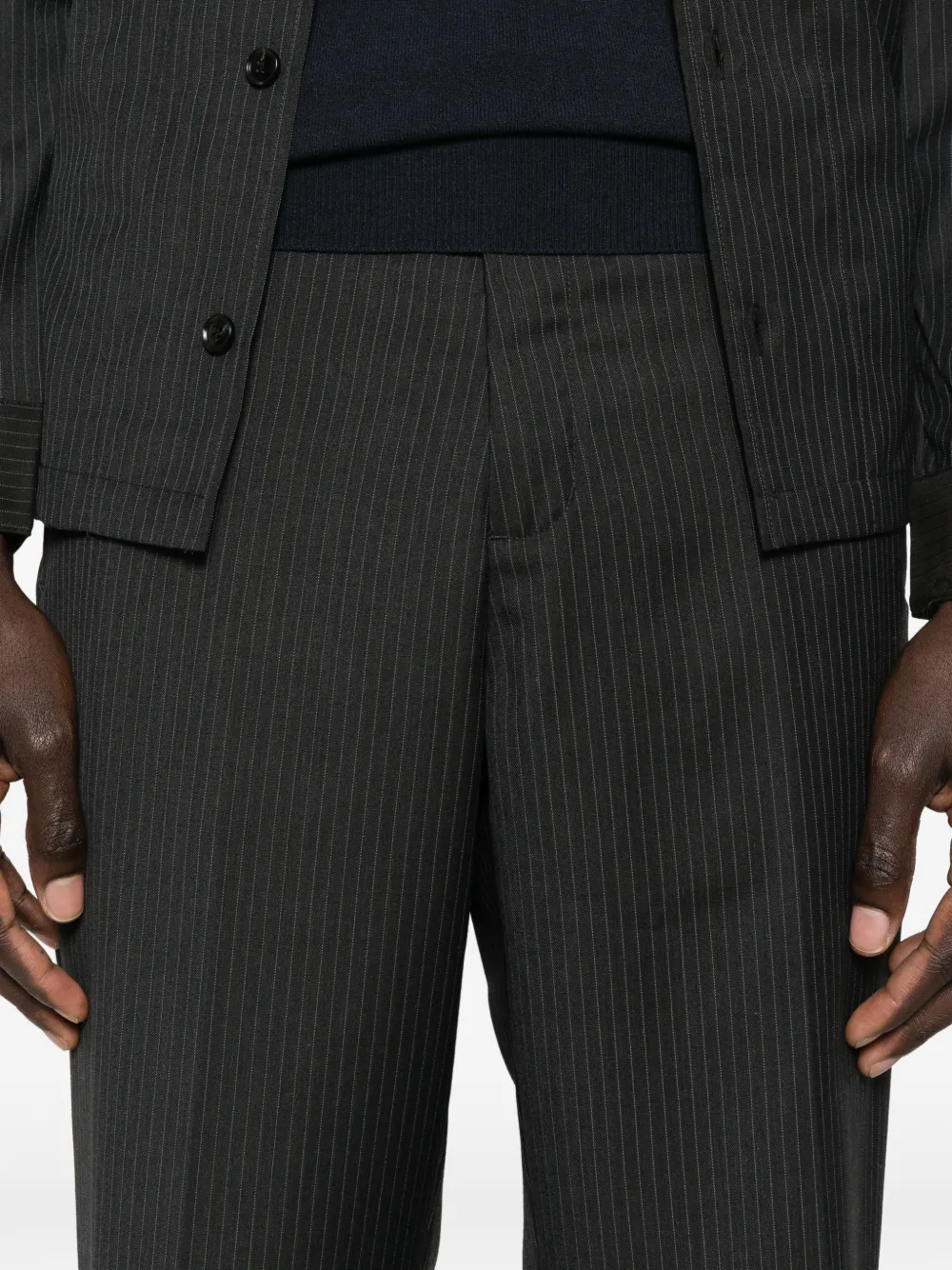 Черный с игольчатым полосатым узором, шлёвки для ремня, боковые прорезные карманы, застёжка на пуговицу