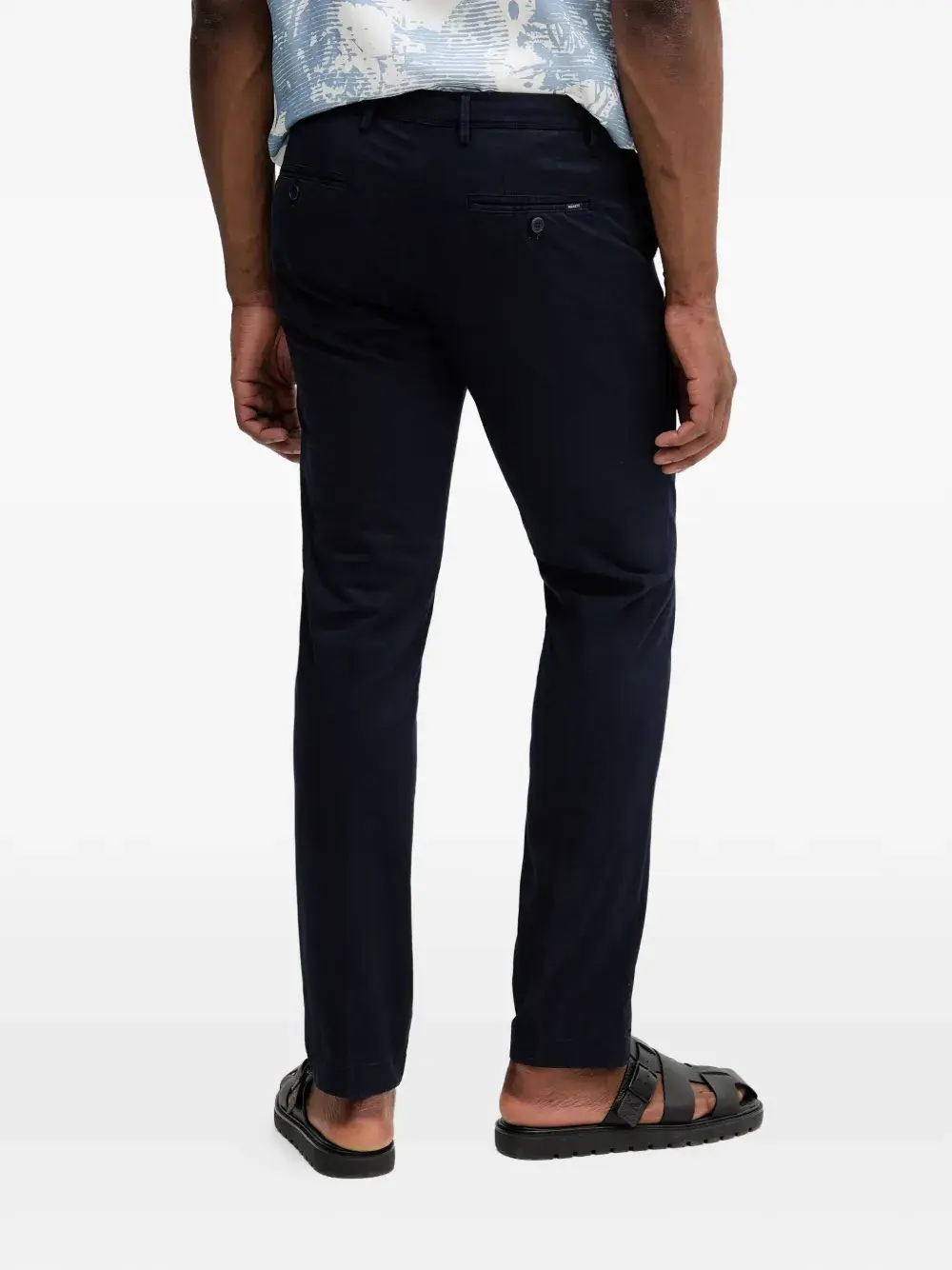Темно-синий, застежка на пуговицу, задние прорезные карманы, шлевки для ремня