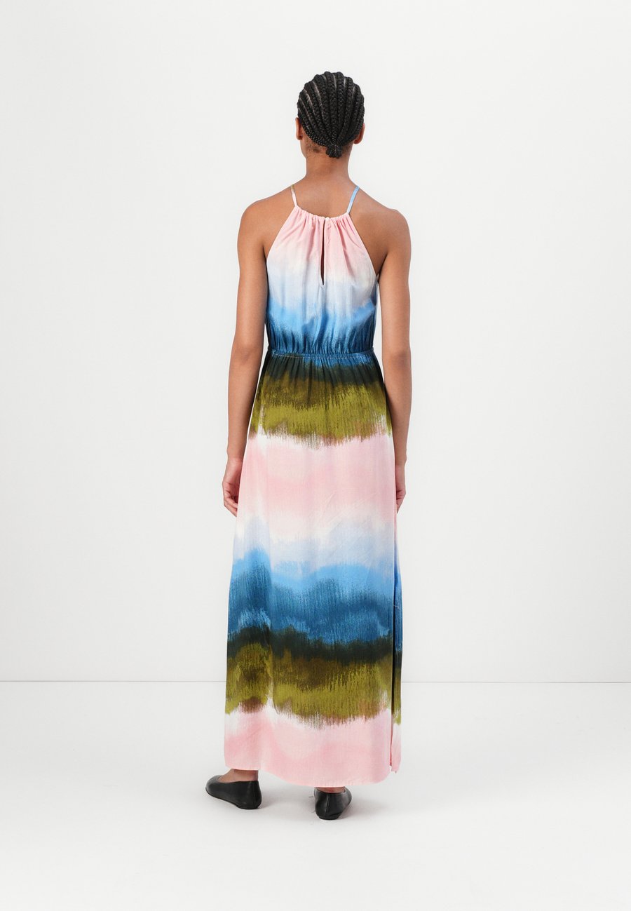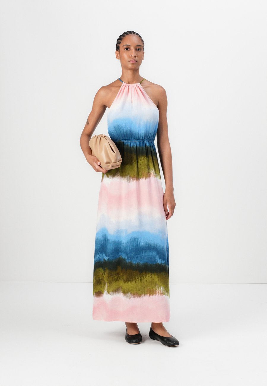 Длинное платье из вискозы с воротником-стойкой. С боковыми разрезами и эластичным поясом. Вырез горловины: круглый.Материал и уход