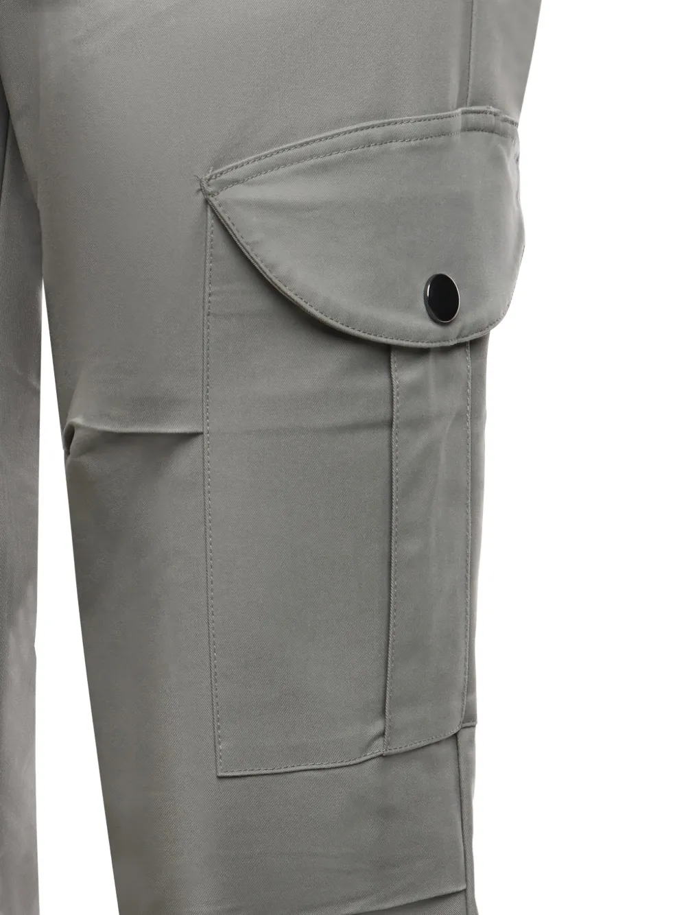 Серый цвет, эластичный пояс, застежка на шнурок, боковые карманы карго, задний карман с клапаном, декоративная пуговица