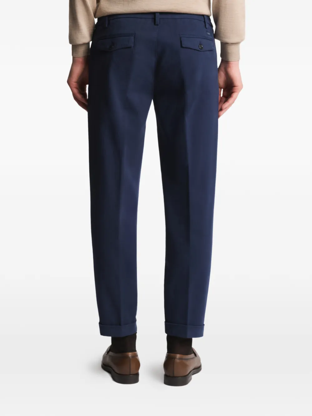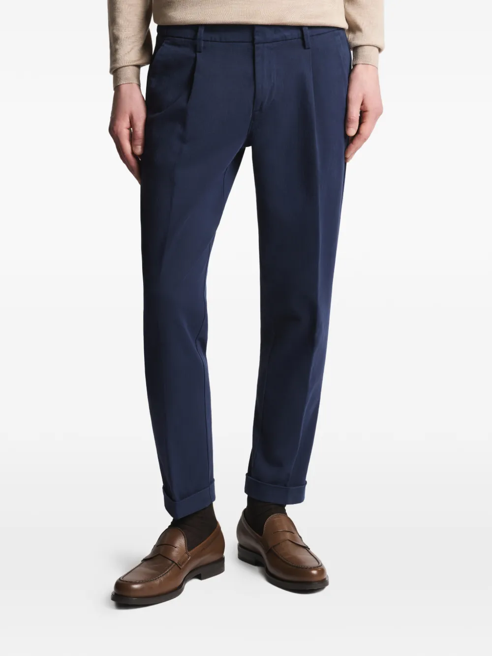 Синий цвет, отвороты на штанинах, шлевки для ремня, два задних кармана на пуговицах, эластичный пояс, складки