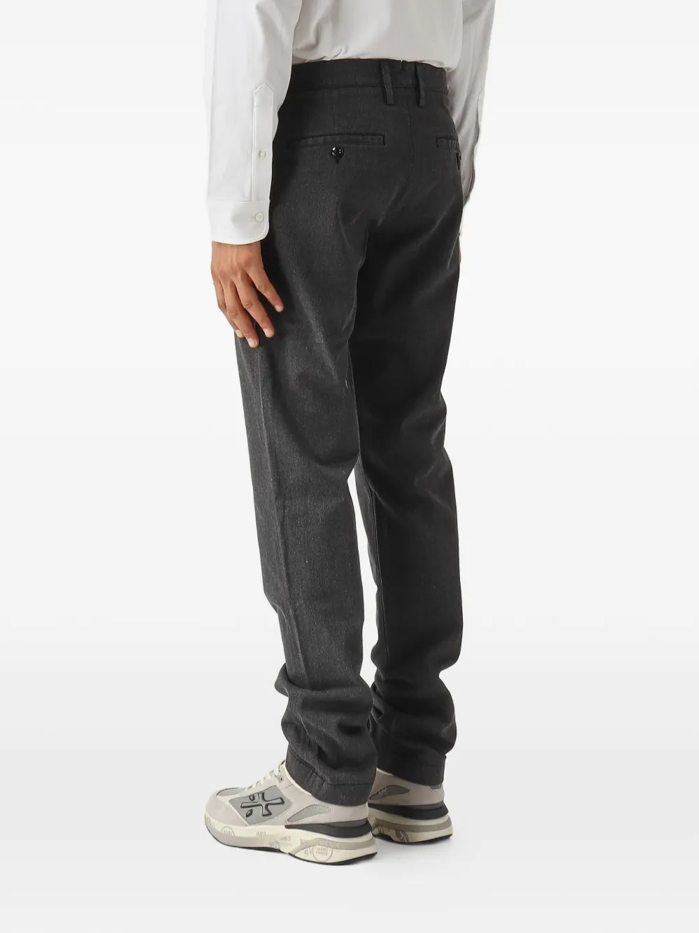 Темно-серый текстурированный материал, застежка на пуговицы, шлевки для ремня, задний прорезной карман, логотип
