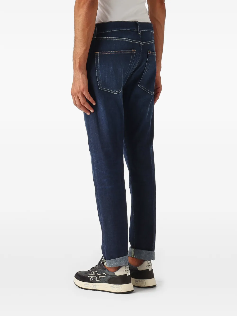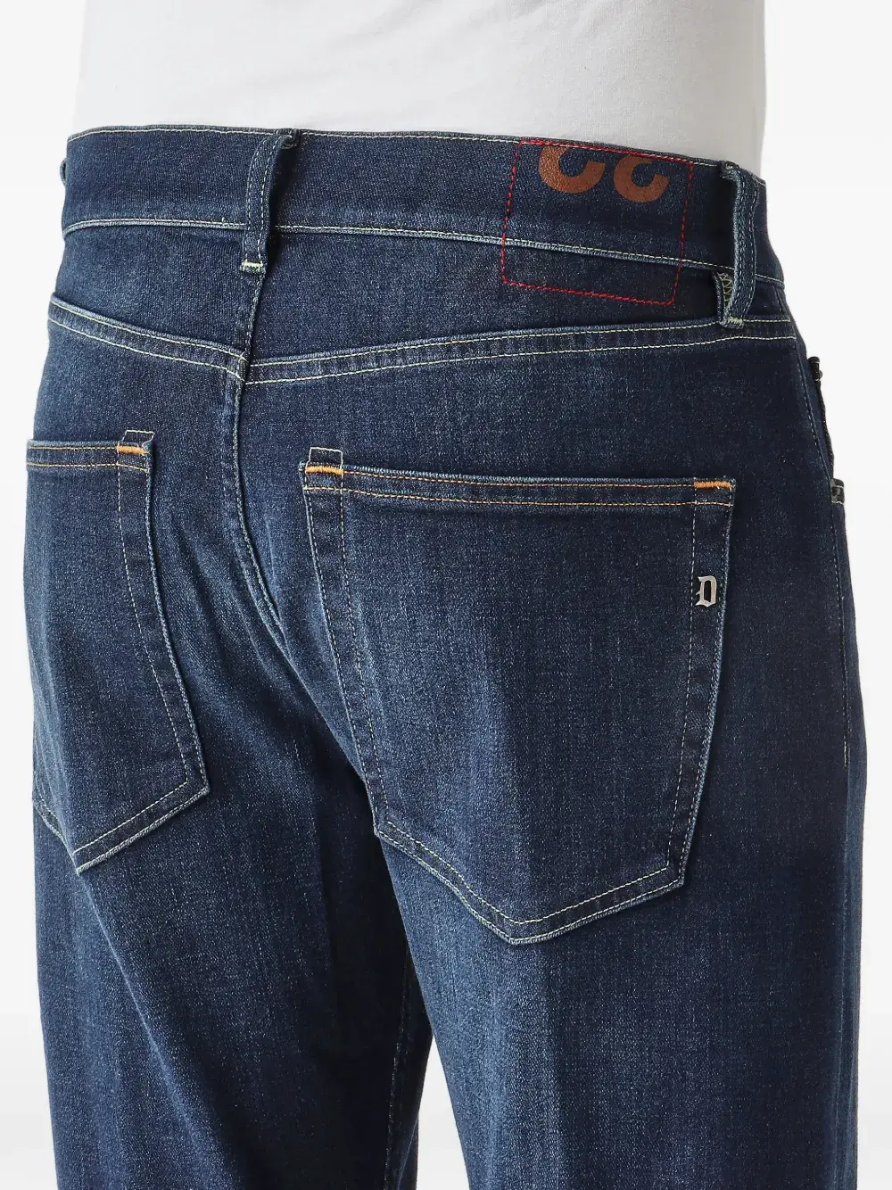 Темно-синий цвет, нашивка с логотипом, задние карманы, шлевки для ремня, отстрочка, подвернутый край