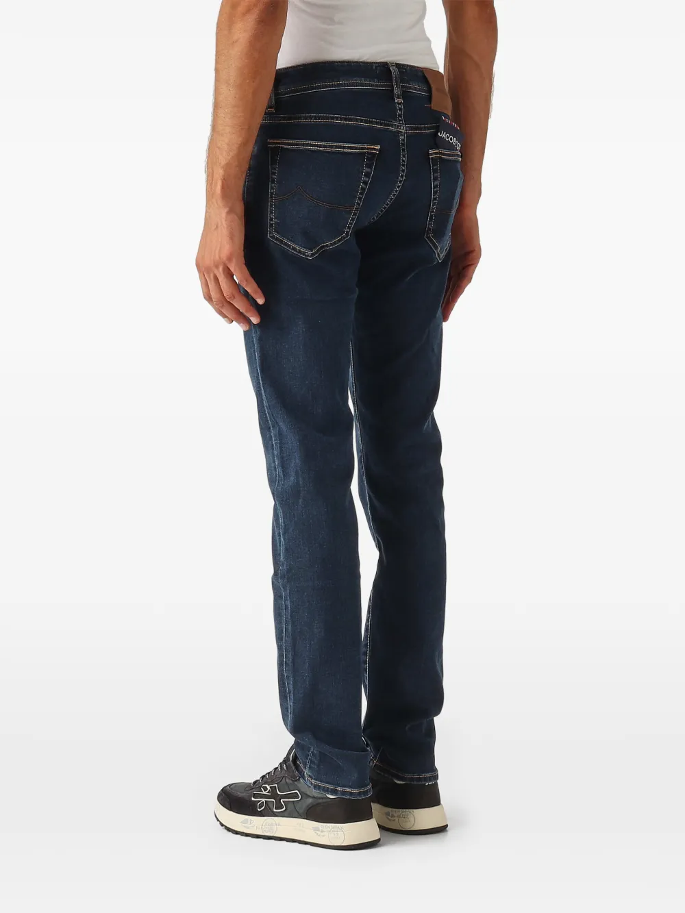 Темно-синий, задний карман с деталями, шлевки для ремня, пять карманов, прострочка, застежка на пуговицу