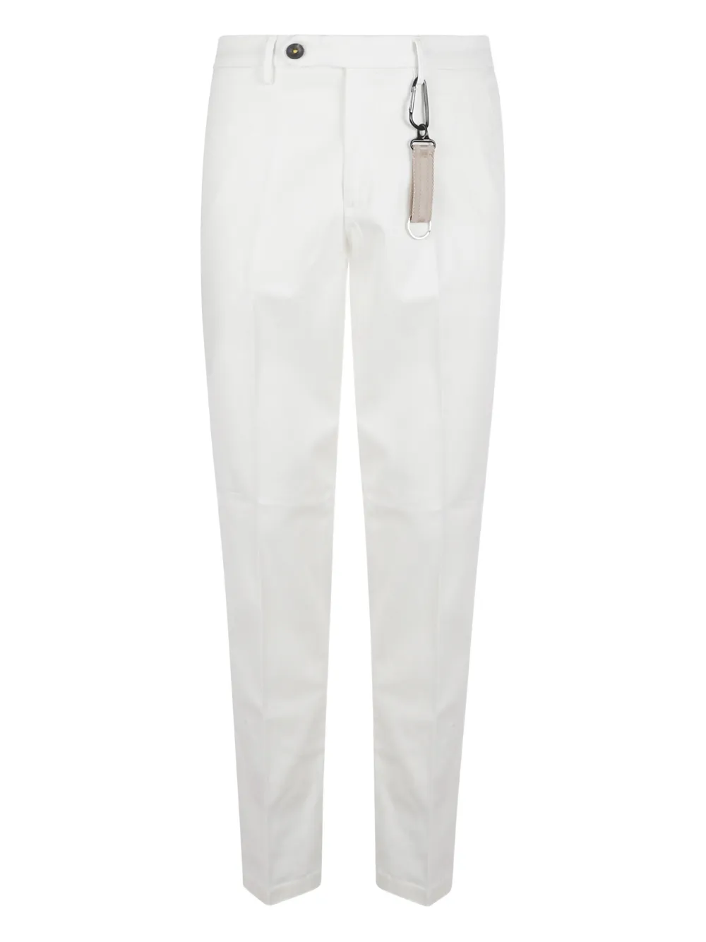 Белый цвет, шлевки для пояса, застежка на пуговицу, карабин, прорезные карманы сзади