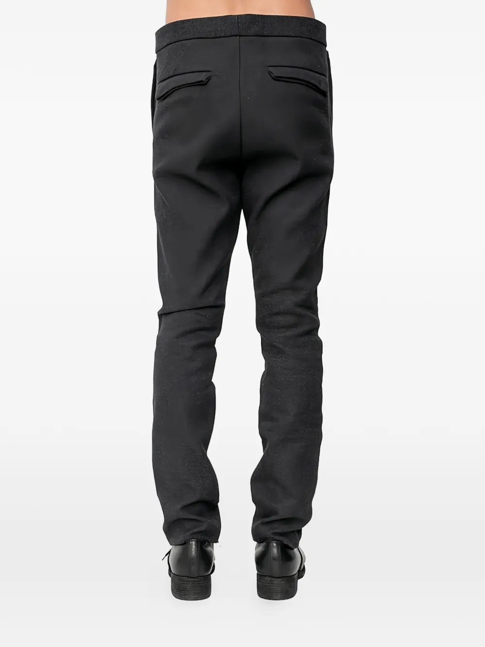 Темно-серые брюки с заниженной промежностью, задними клапанными карманами и скрытой фронтальной застежкой