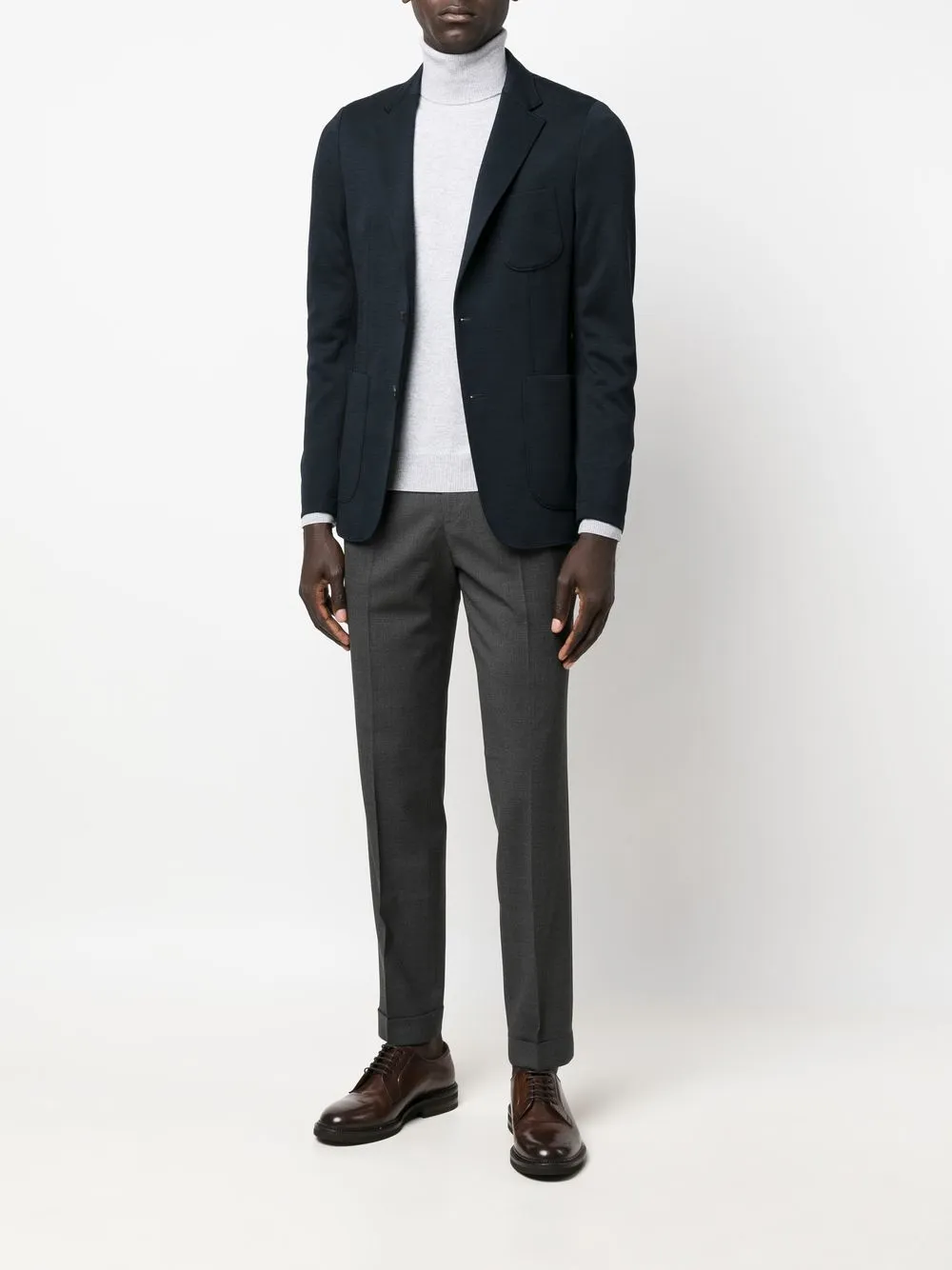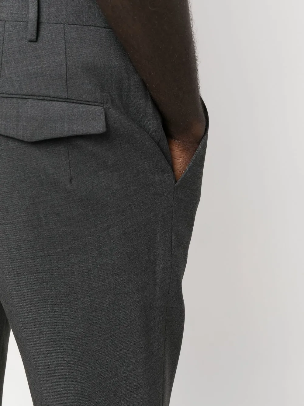 Антрацитово-серый, эластичная шерсть, петли для ремня, застежка на молнию и крючок, два вшитых кармана по бокам, два кармана с клапанами сзади и зауженный крой.
