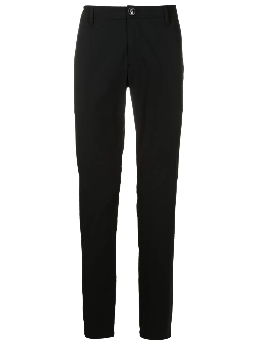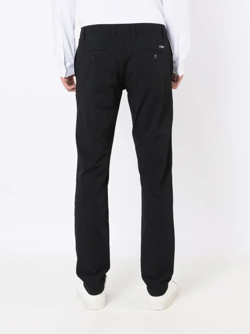 Черный, эластичный материал, серебристый металлический логотип, потайная застежка на молнии и пуговицах, два кармана по бокам, два кармана на пуговице сзади, петли для ремня и прямой крой.