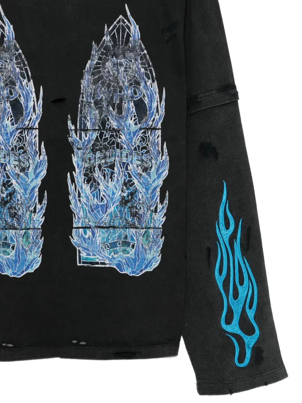 Тёмно-серая футболка с графическим принтом в виде пламени, круглым вырезом, длинными рукавами и эффектом потертости
