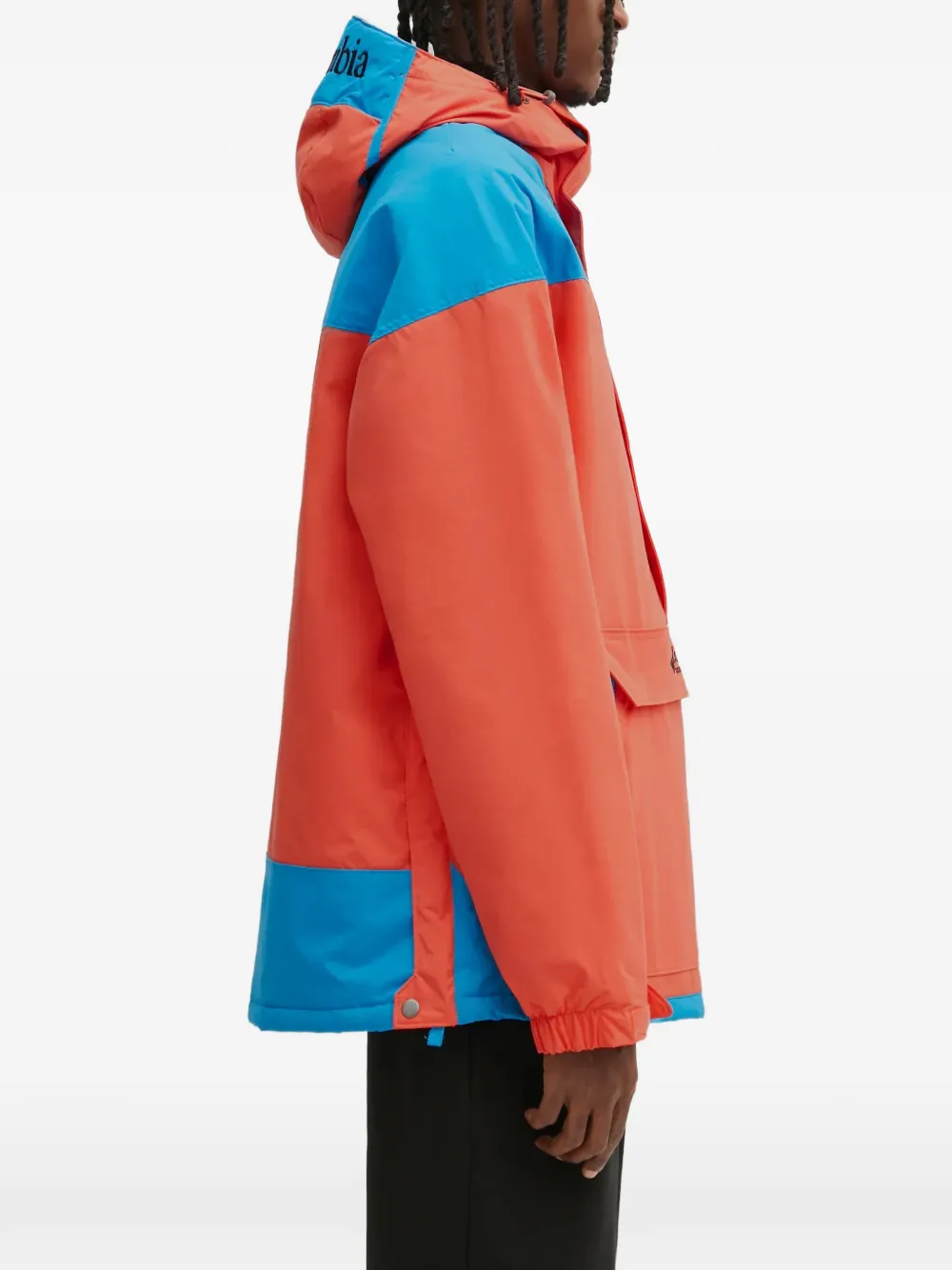 Оранжево-синий дизайн с цветными блоками, капюшон, передний карман из сетки, накладной карман с клапаном