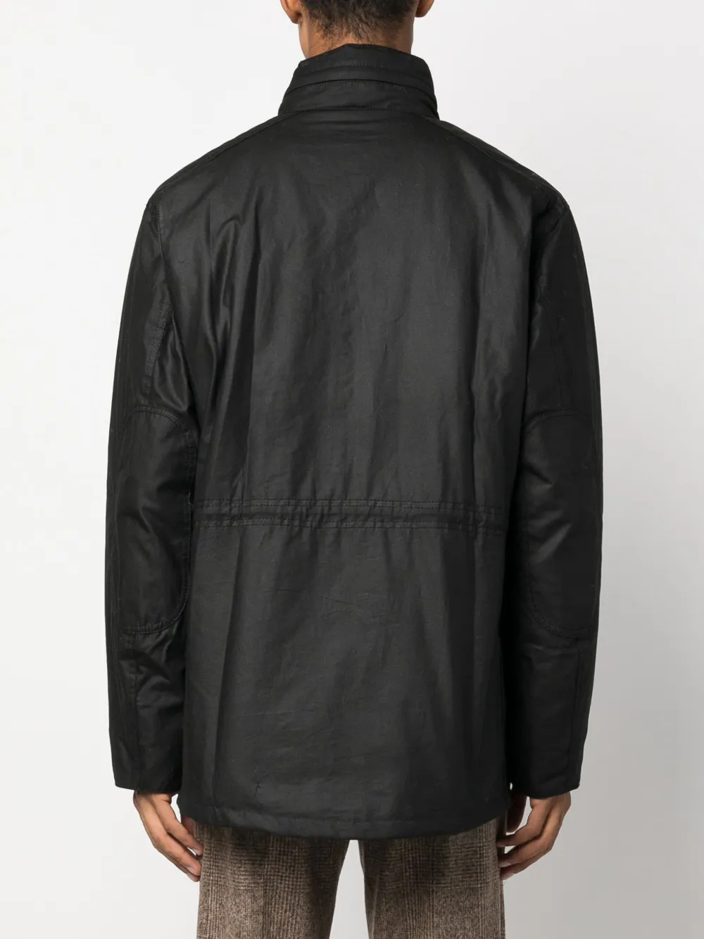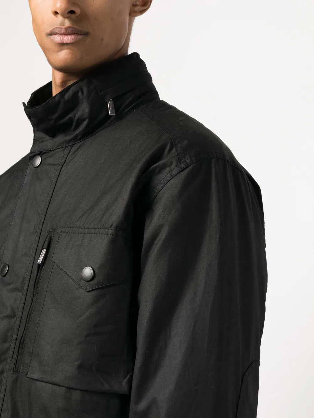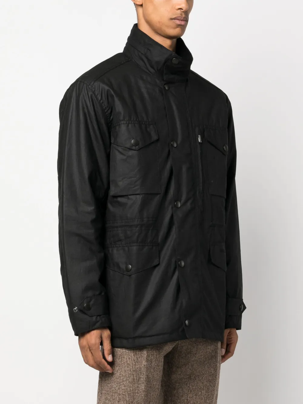 Черный, хлопок, растительный воск, высокий воротник, застежка на кнопки и молнию спереди, два нагрудных кармана с клапанами, два передних кармана с клапанами, длинные рукава, манжеты с ремешками и стеганая подкладка.