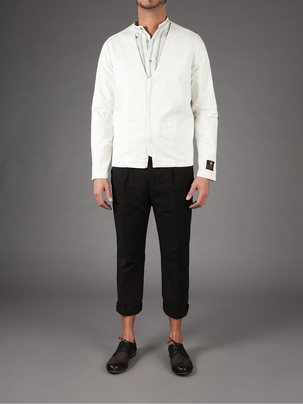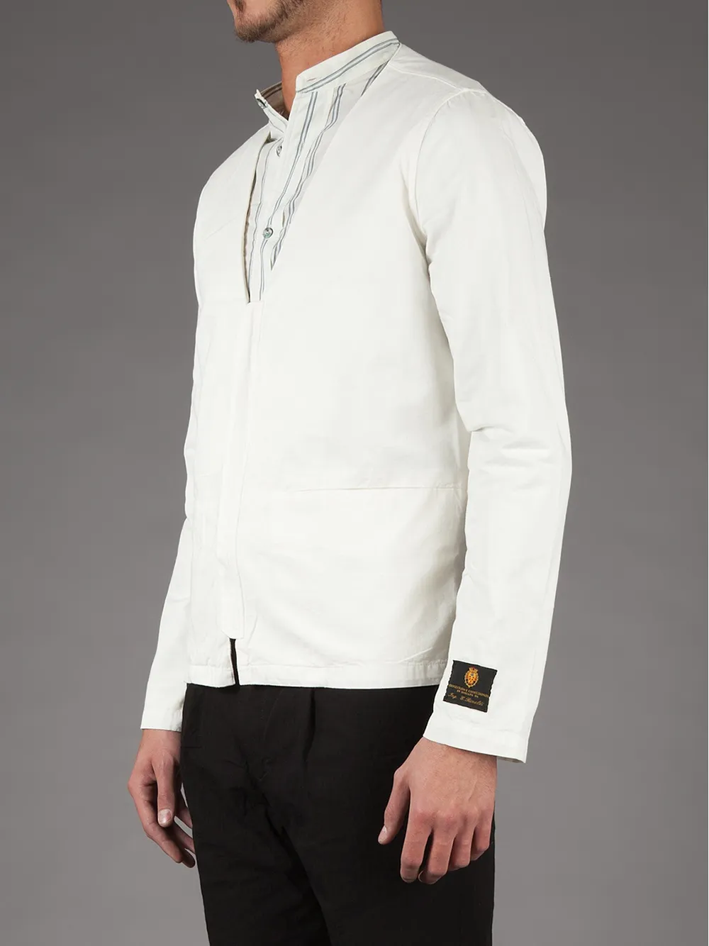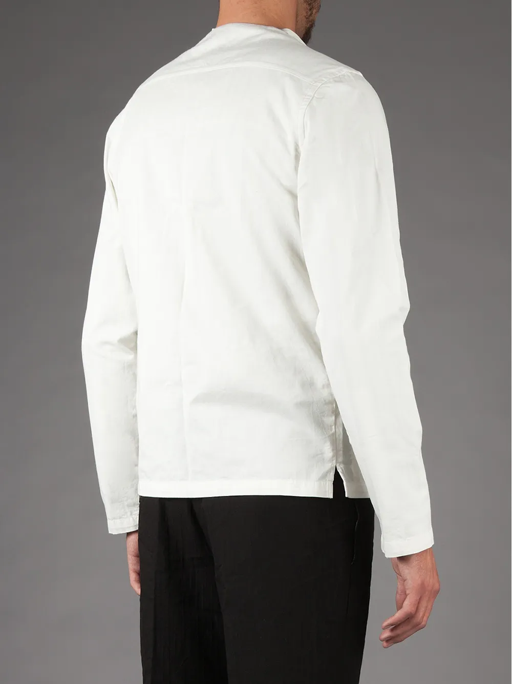 White cotton jacket from Emiliano Rinaldi featuring a V-neck, a concealed front fastening, long sleeves, a logo patch on one cuff and side slits at the hem.