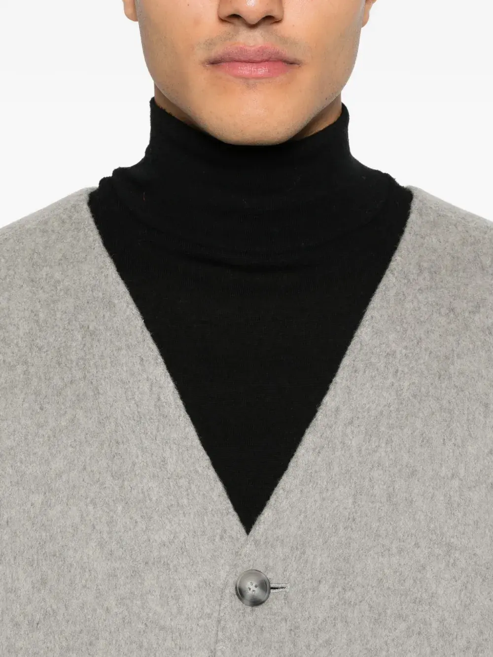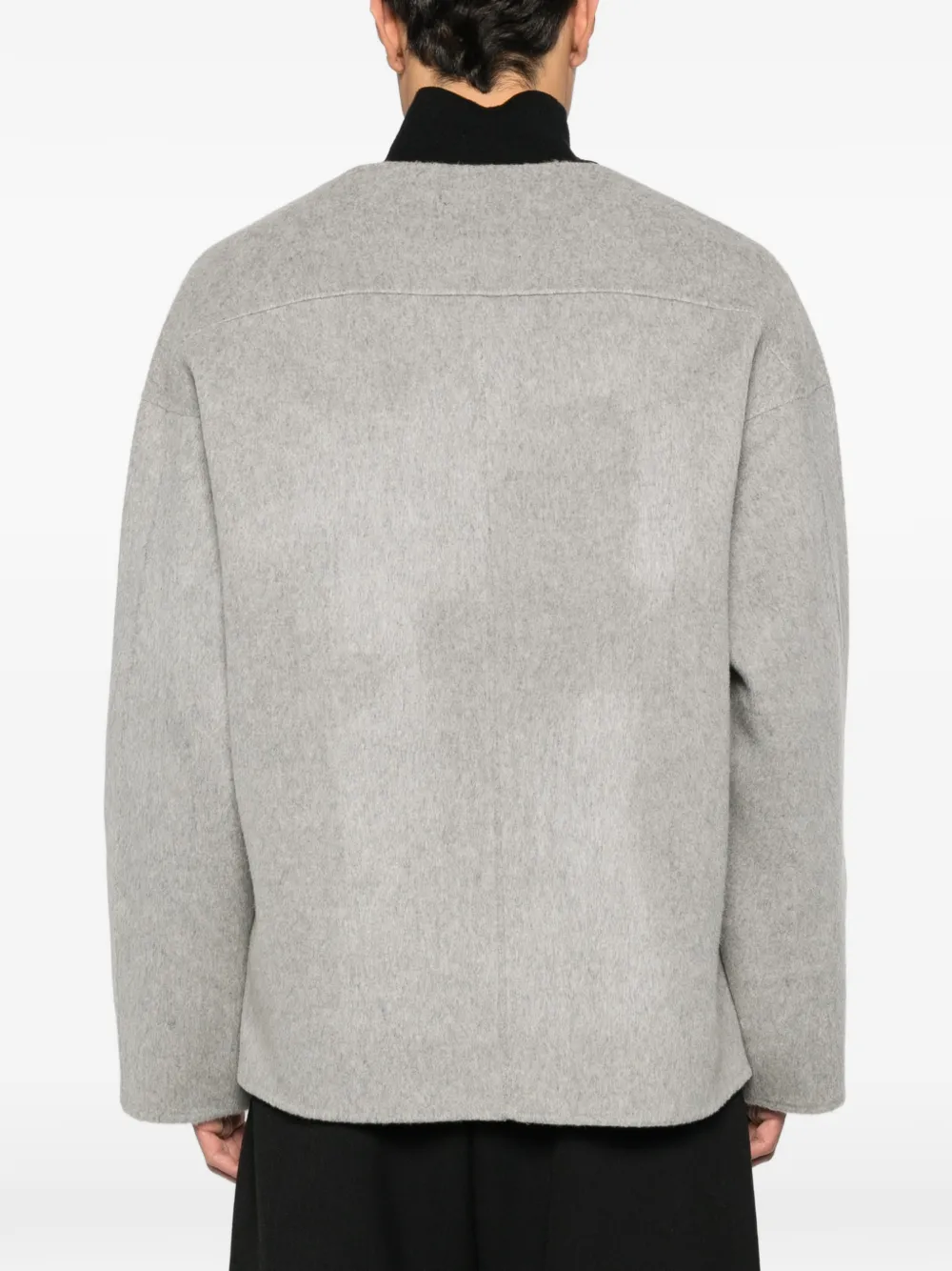 Серый безворотничковый пиджак на пуговицах с длинными рукавами и тональной прострочкой