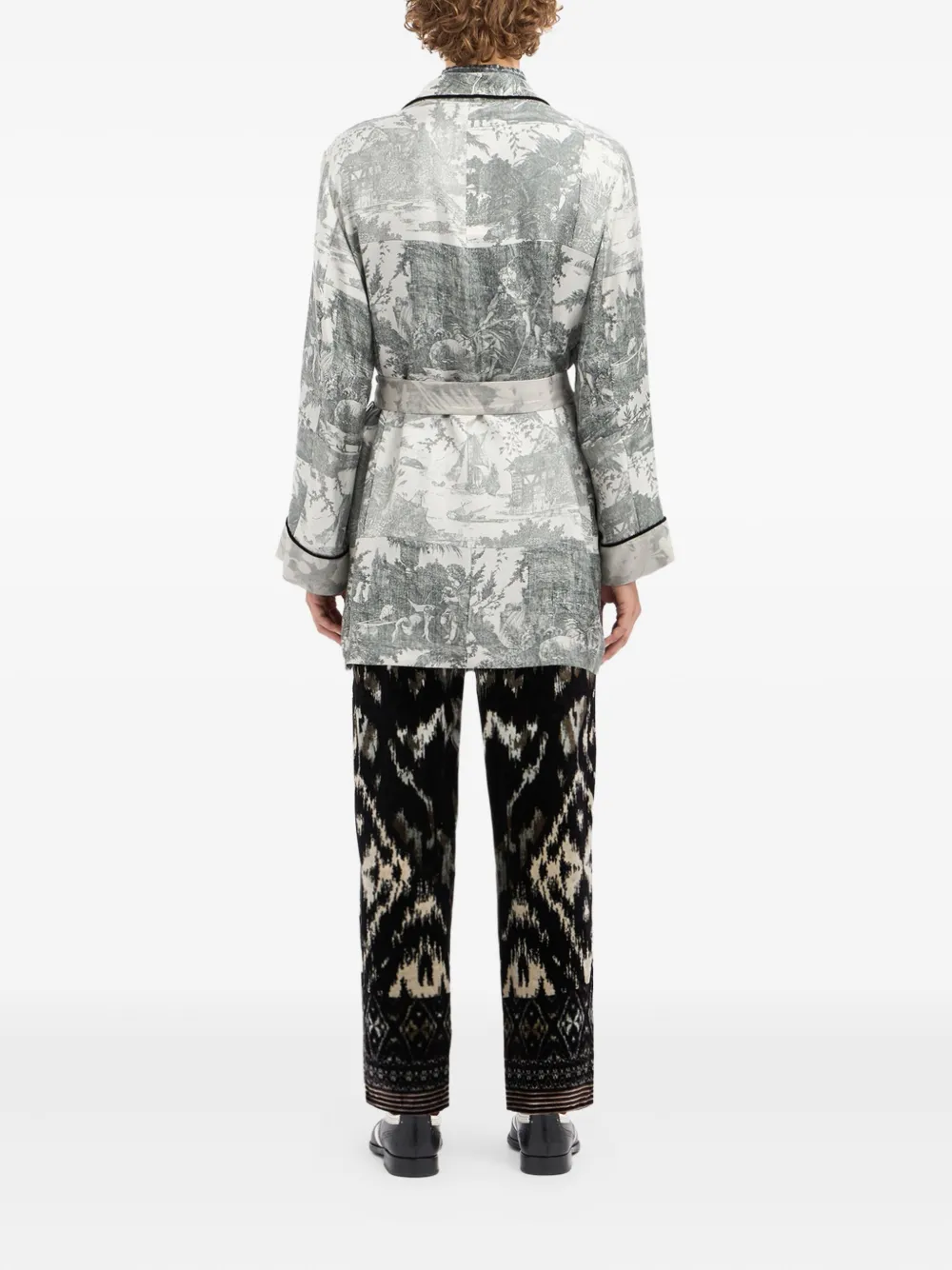 Серый принт с пейзажем шальковый воротник самозавязывающийся пояс длинные рукава кант по краю