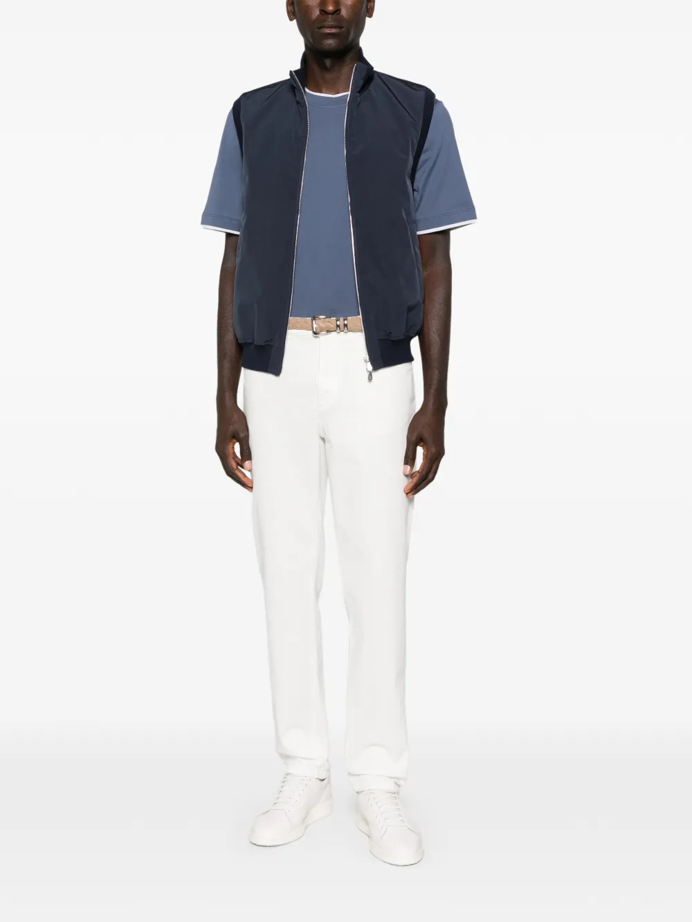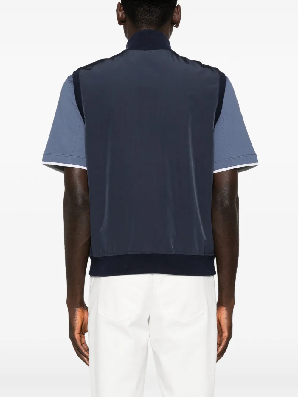 Синий жилет с воротником-стойкой, застёжкой-молнией, без рукавов, рубчатым подолом и прорезными карманами