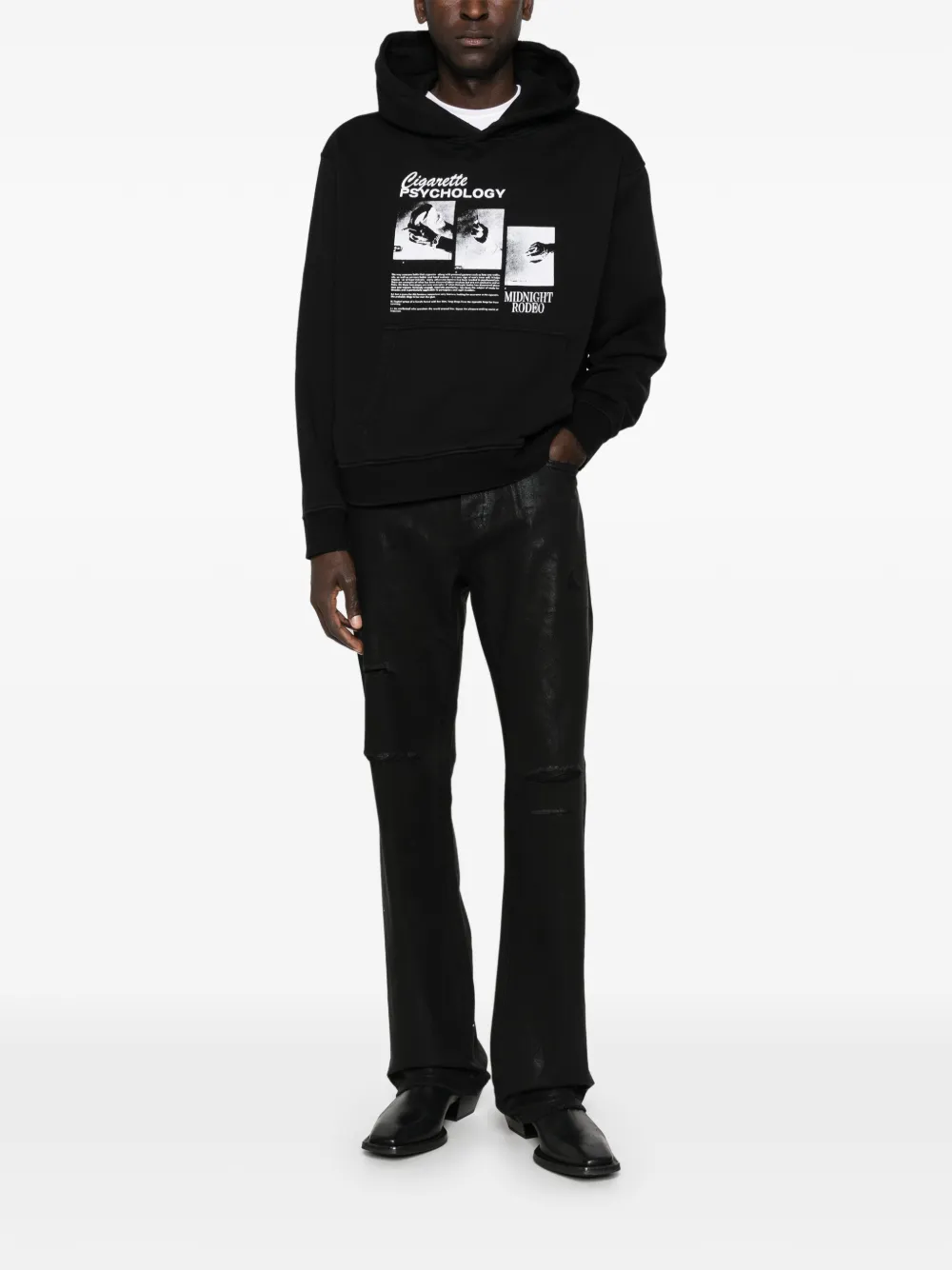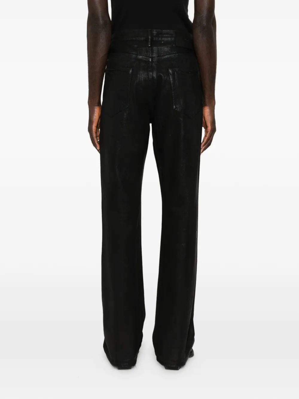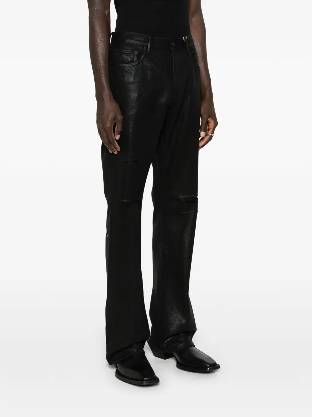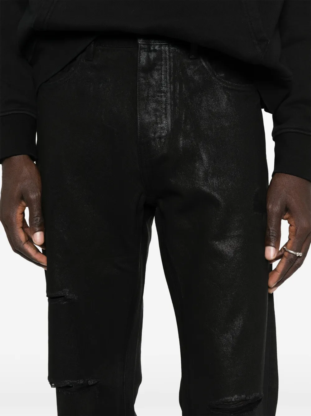 Черные джинсы с эффектом потертости, необработанным краем, пятью карманами, шлевками для ремня и застежкой на пуговицу