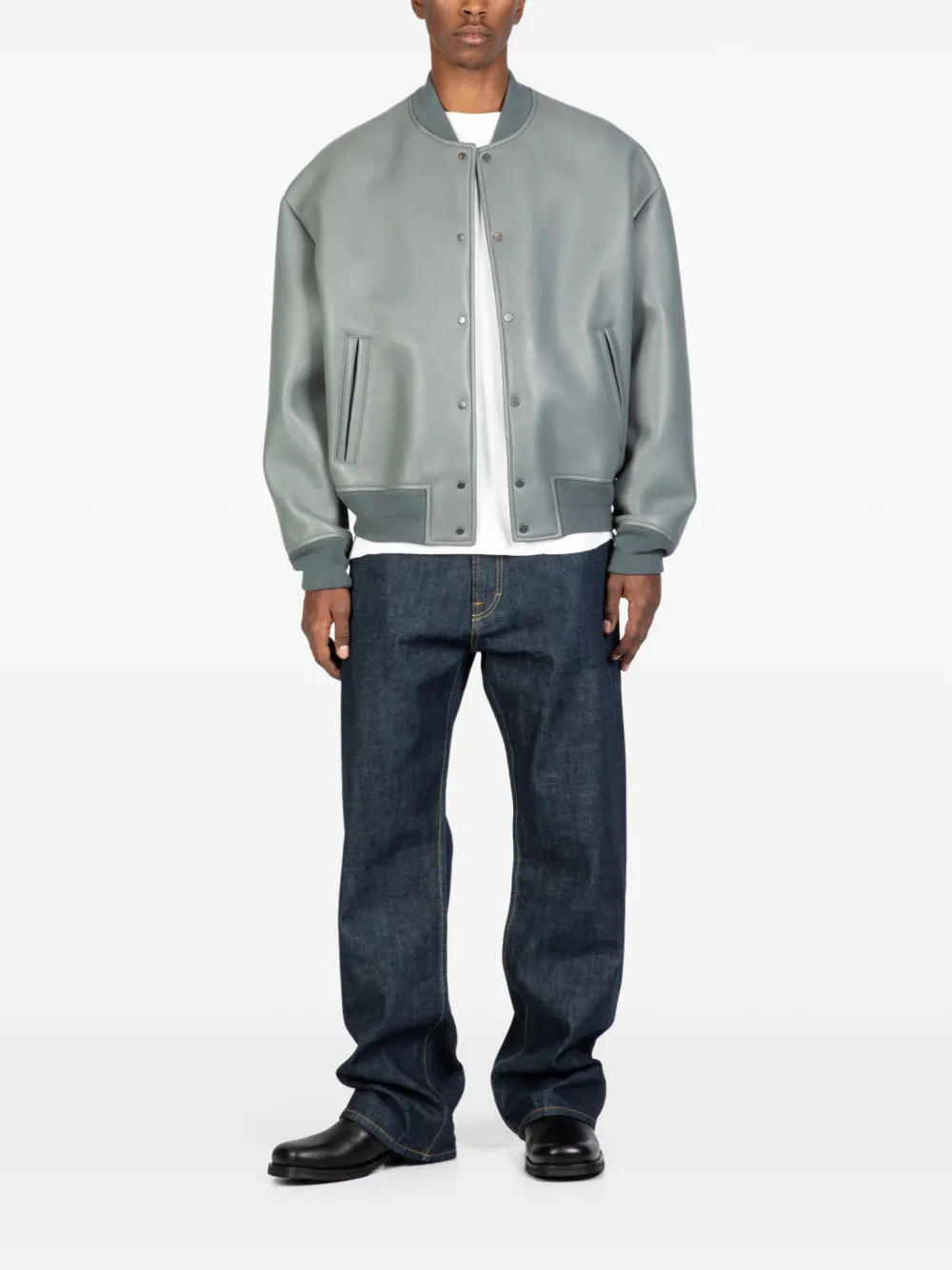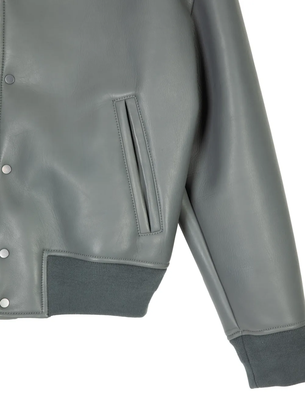Серая кожаная куртка с застёжкой на пуговицы спереди, ребристым подолом, ребристыми манжетами и передними карманами