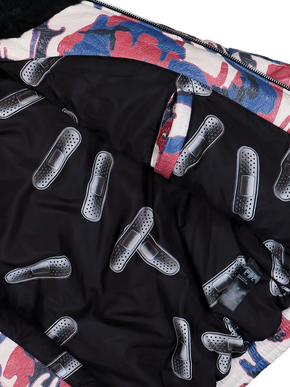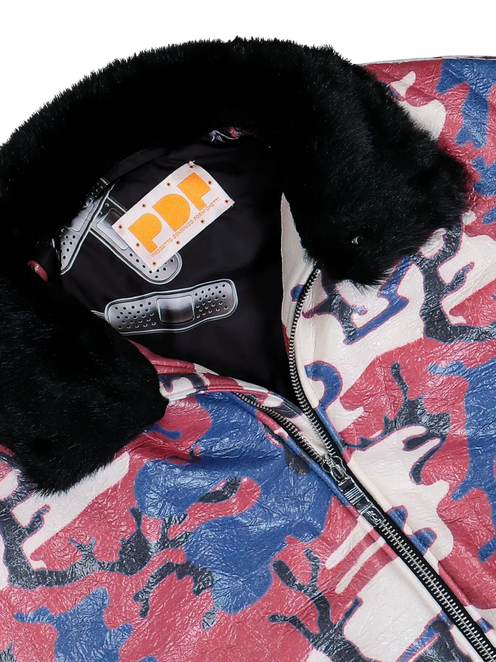 Белый разноцветный камуфляжный принт, искусственный меховой воротник, эффект фольгированного покрытия, структурированный силуэт, застежка-молния, накладной карман на подкладке