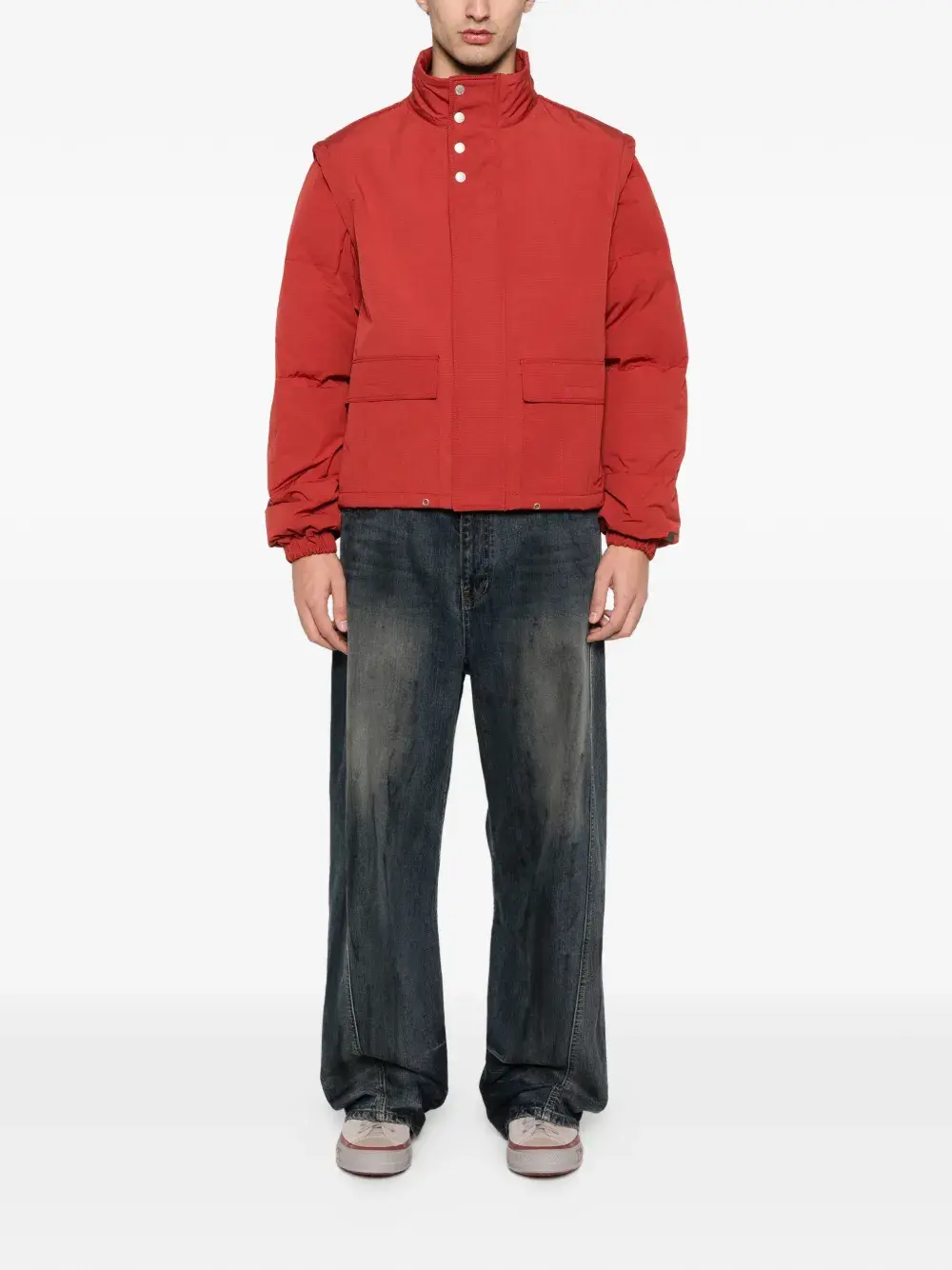 Выцветший красный цвет, застежка-молния спереди, накладные карманы с клапанами, высокий воротник, декоративные кнопки, съемные рукава