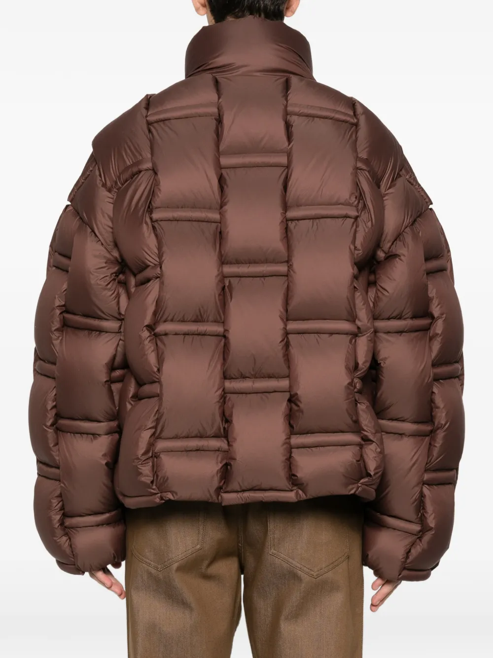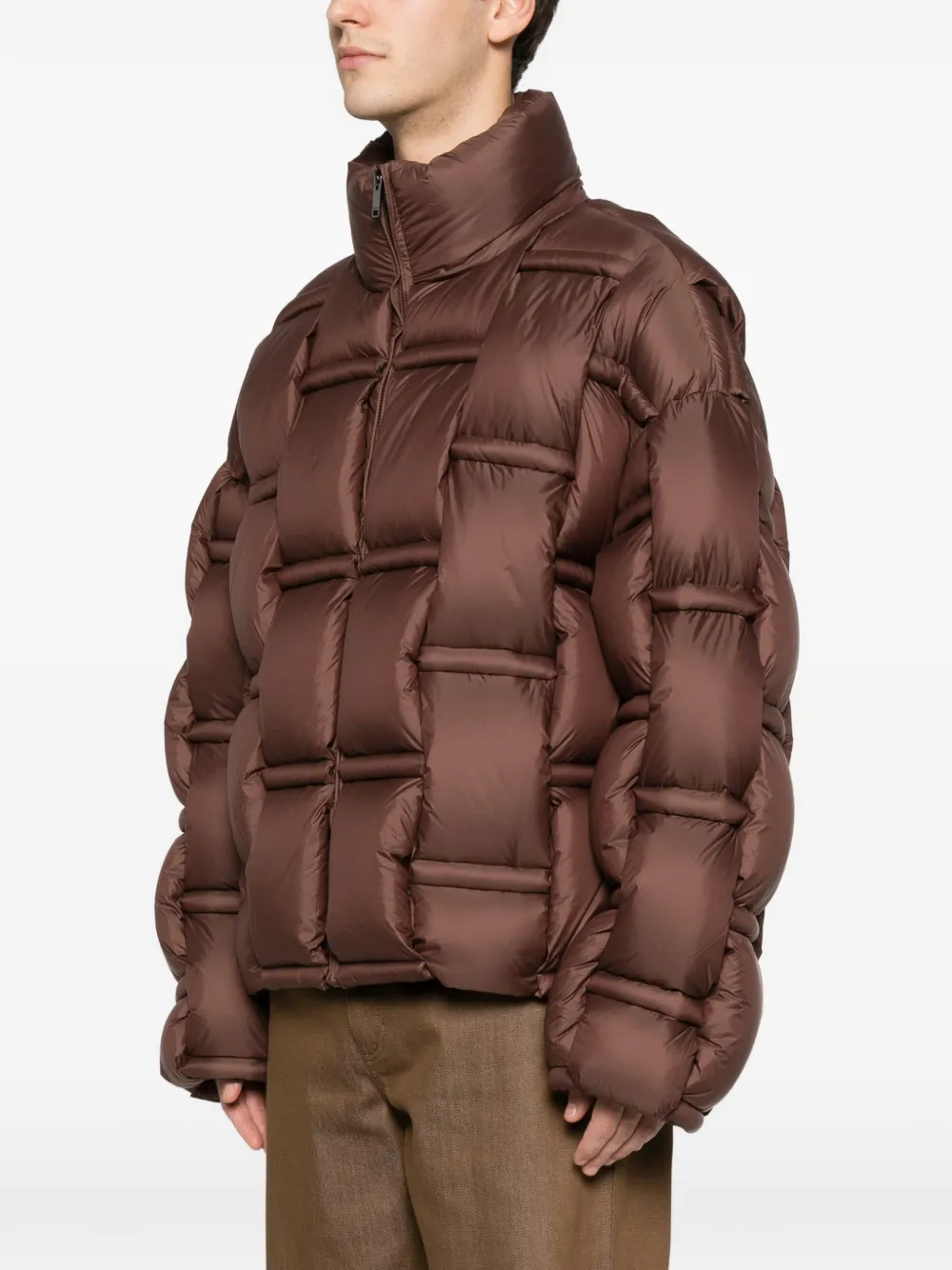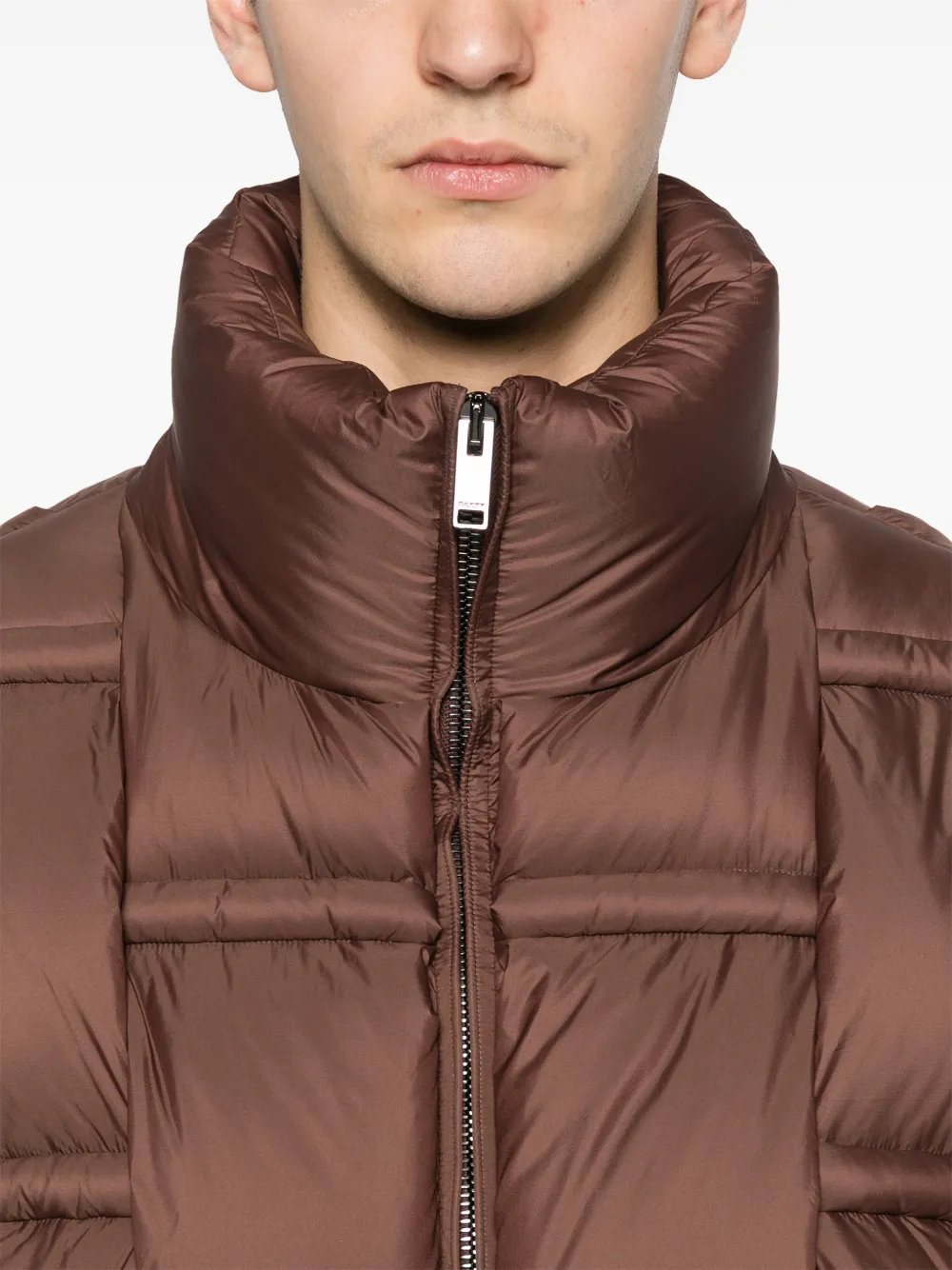 Коричневый стеганый дизайн с панелями, высокий воротник, застежка-молния, длинные рукава